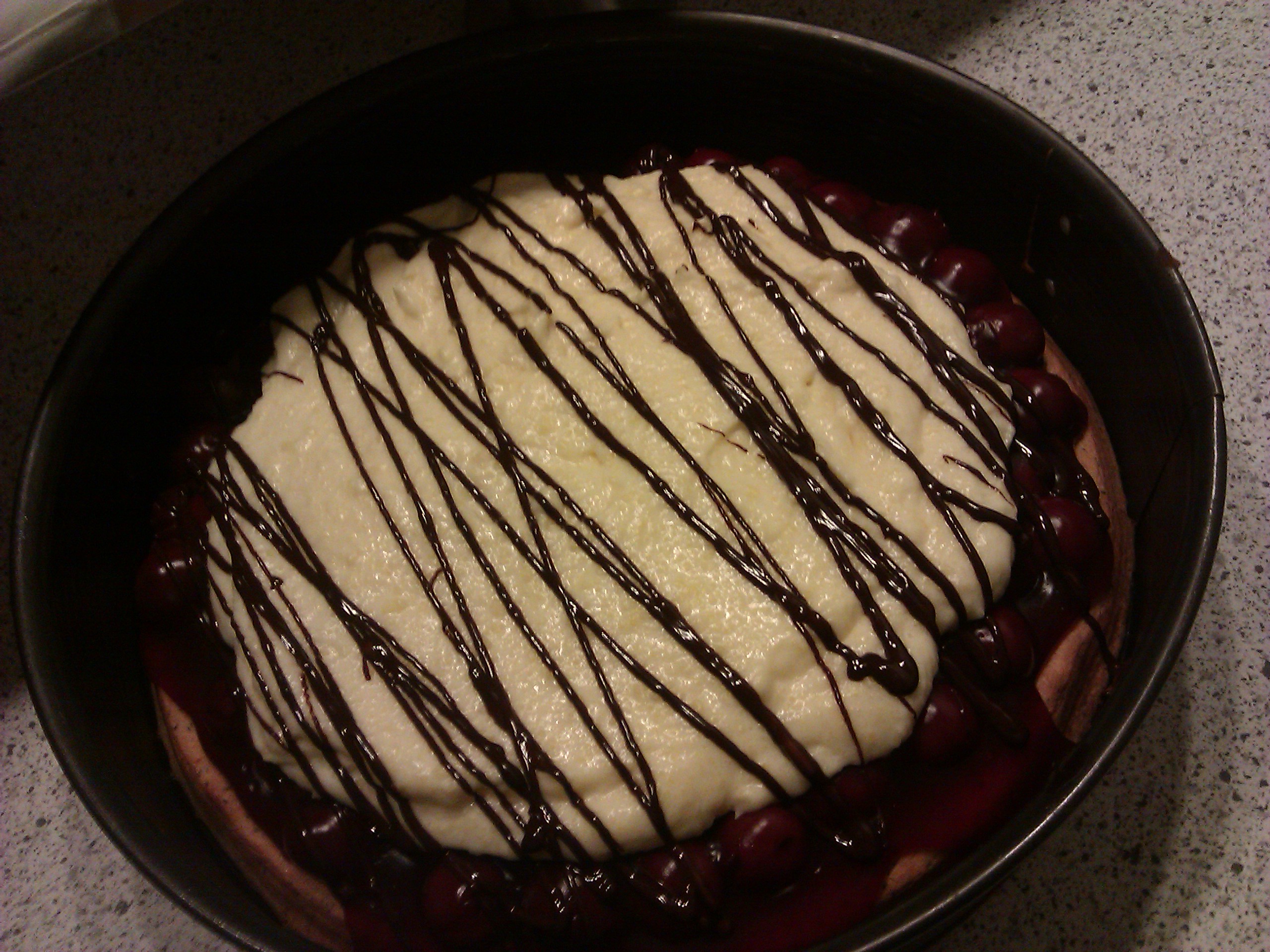 Put the cherry topping on the cake base.  Whip 200 grams of cream and put it on top of the cooled down cherry topping. Put 50 grams of chocolate in a freezer bag and knot it tightly and put it in a mug with hot water. Wait until the chocolate is melted, then cut off one edge of the freezer bag and decorate the cake with chocolate stripes.