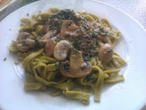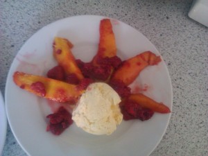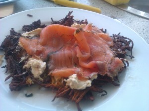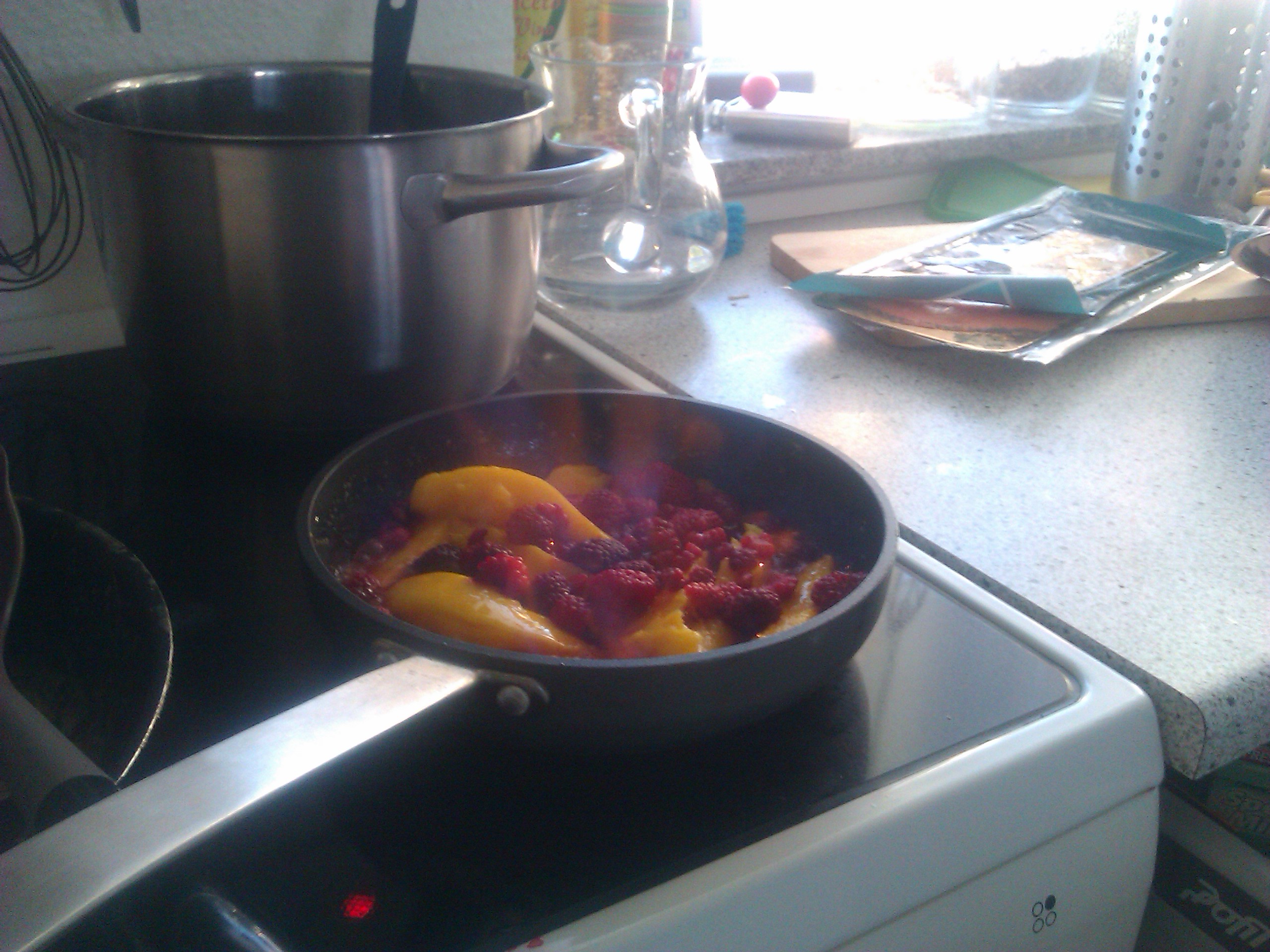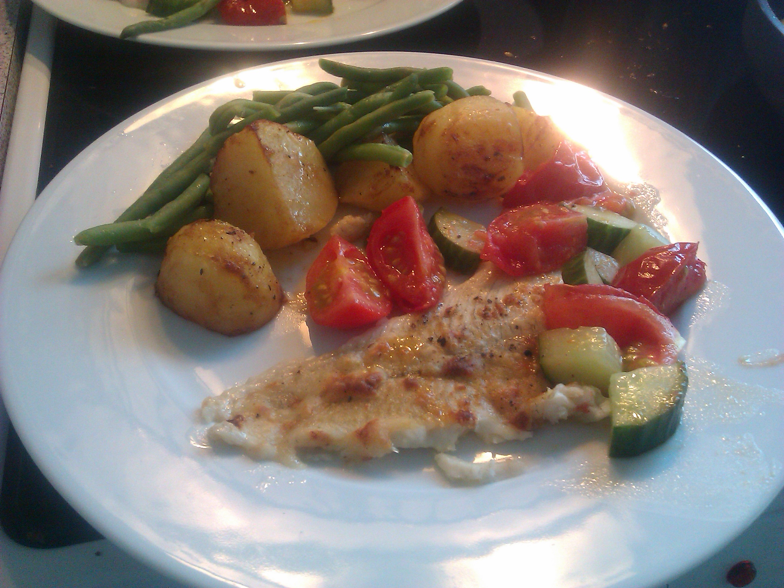 Rinse and dry two fish fillets and put them in a small ovenproof dish. In a small bowl mix one tablespoon of flour with 50 ml of cream. Spread cream mixture over the fish and sprinkle with salt and pepper. Place the dish on the plate next to the potatoes and bake in the oven at 225 degrees Celsius for about 15 minutes – the potatoes should be golden.