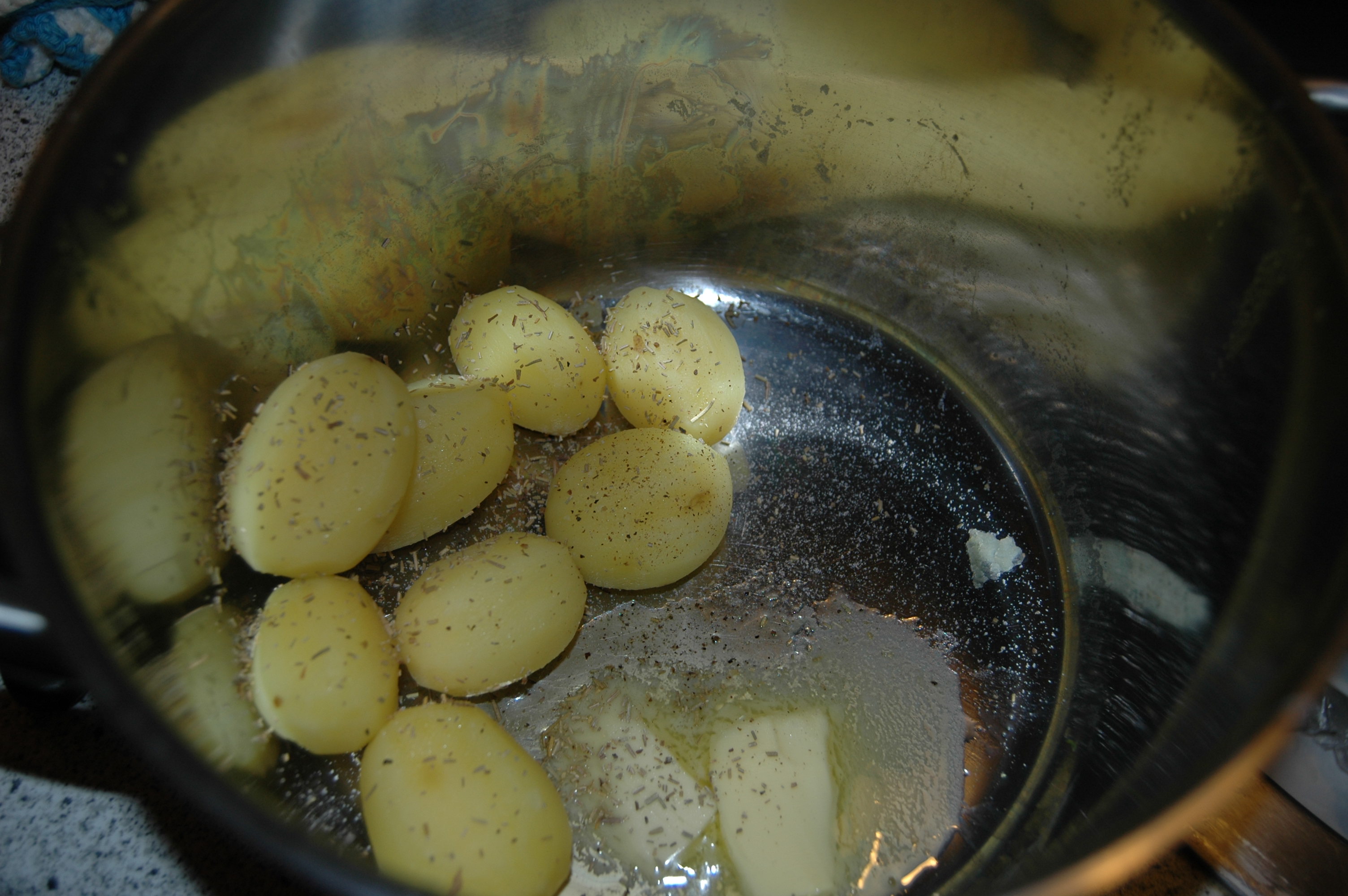 Remove the ends from 500 grams of green beans, put the beans in a sieve and blanch the beans in the sieve above the potatoes for 20 minutes.