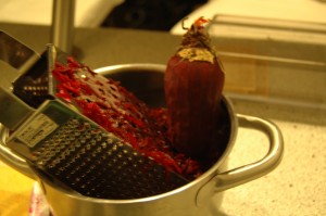 Peel four beet roots and grate them into a pot. |