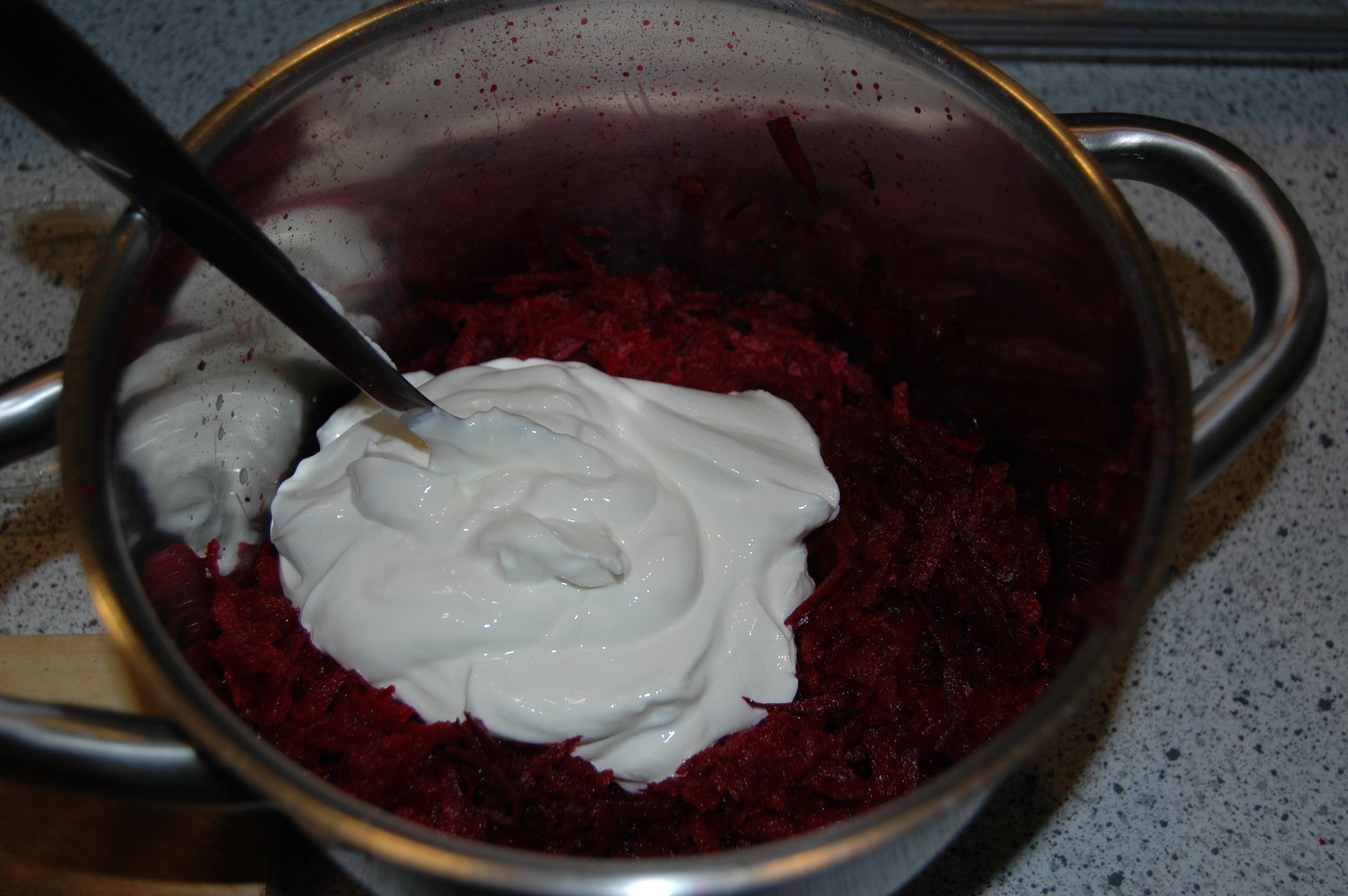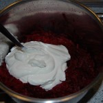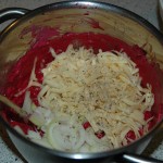 Add 250 grams of crème fraîche. Chop one onion and dash with boiling water before adding to the beet root.