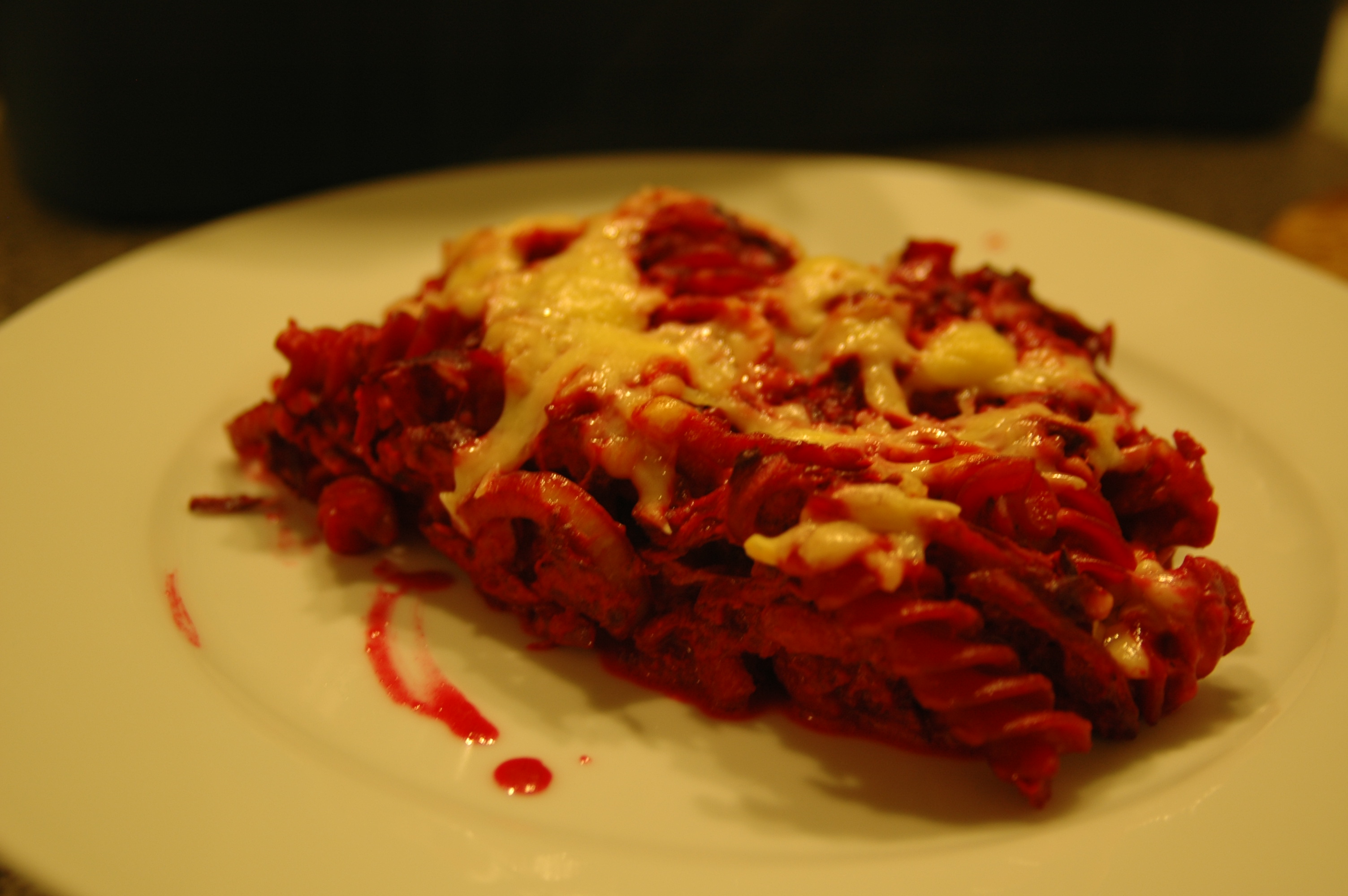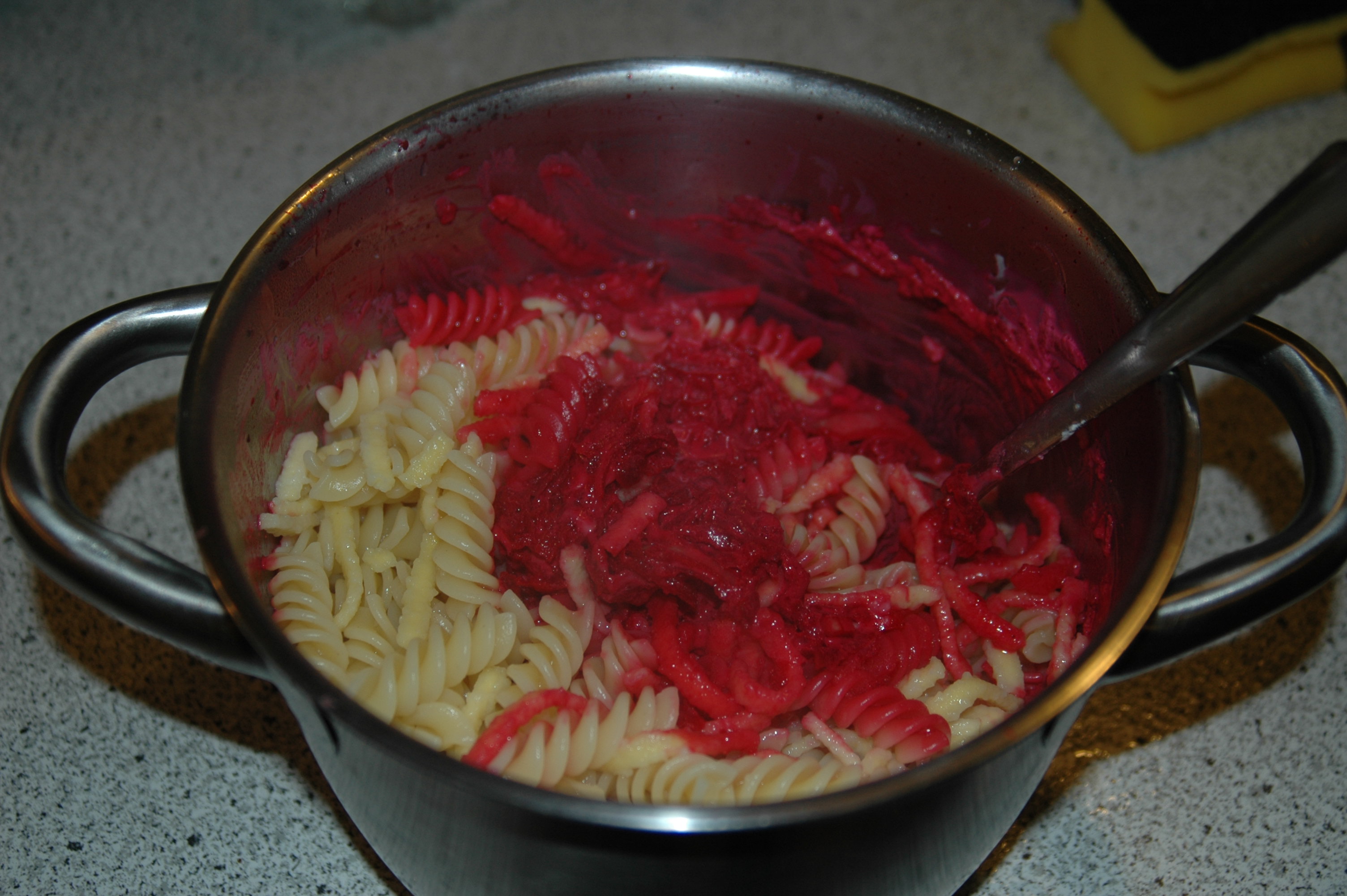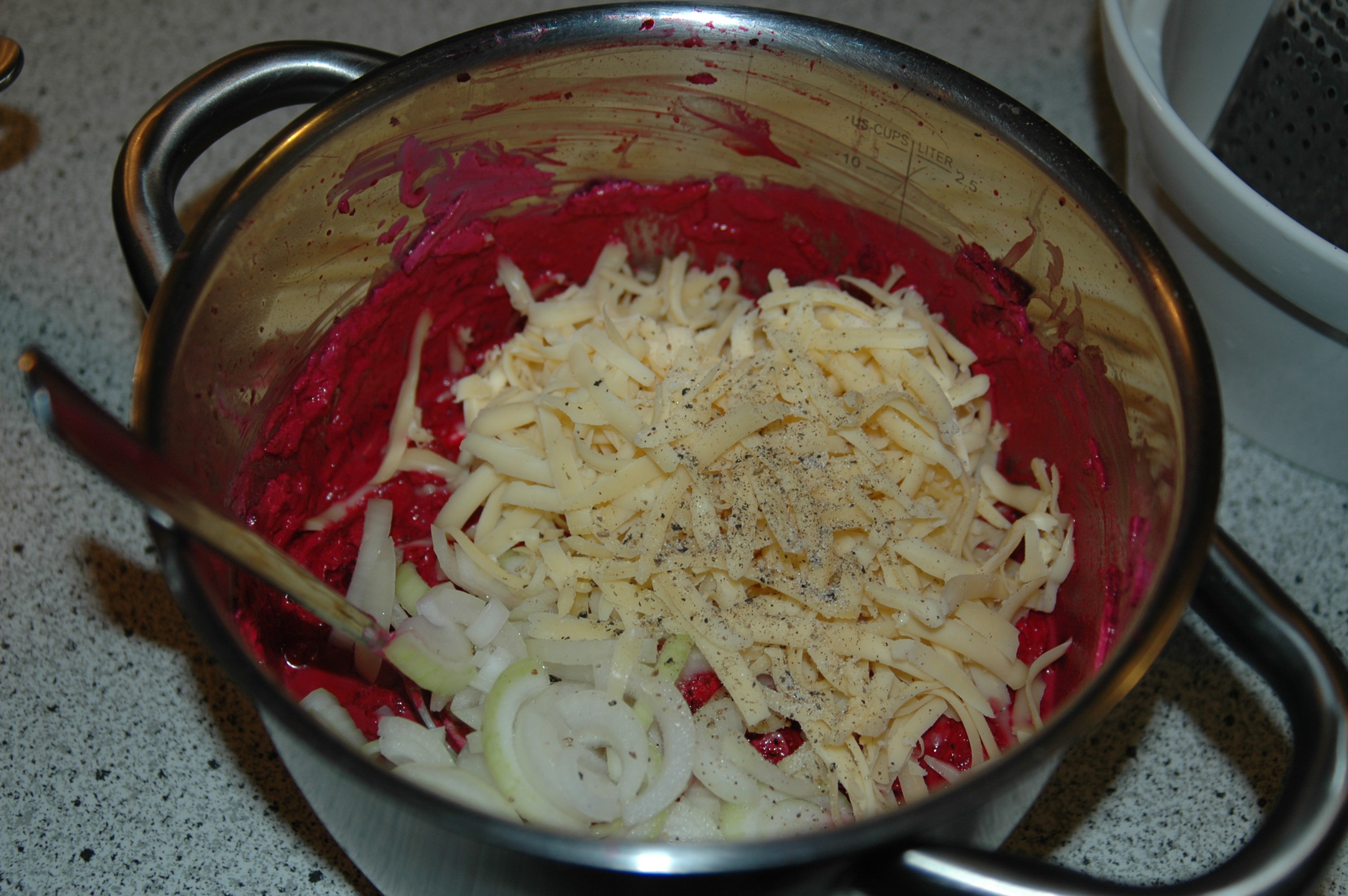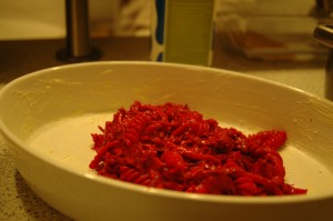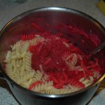 Add 200 grams of grated cheese and one tablespoon of salt and pepper and the drained pasta to the grated beet root and mix.