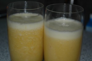 Instead of mixing the shake with milk you can use two cups of orange juice. Leave out the sugar unless you like it really sweet. You might also add a handful of blueberries. |