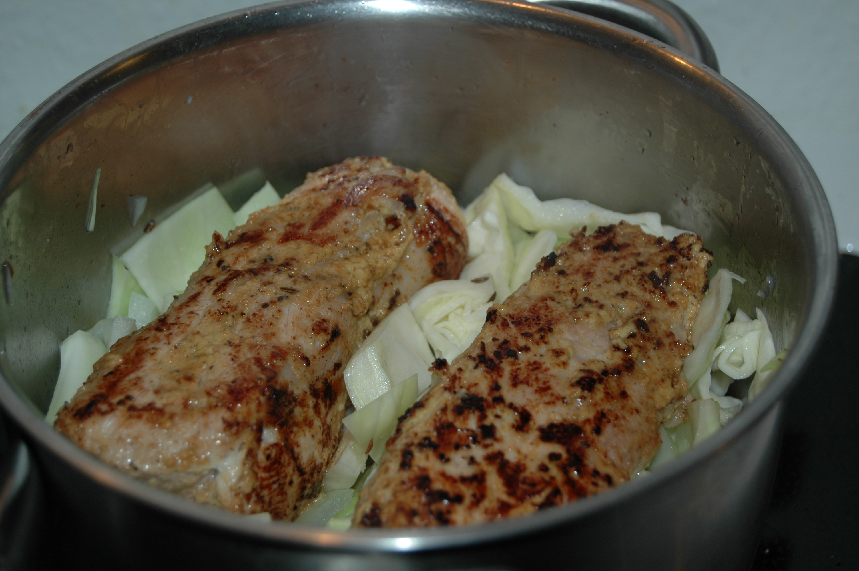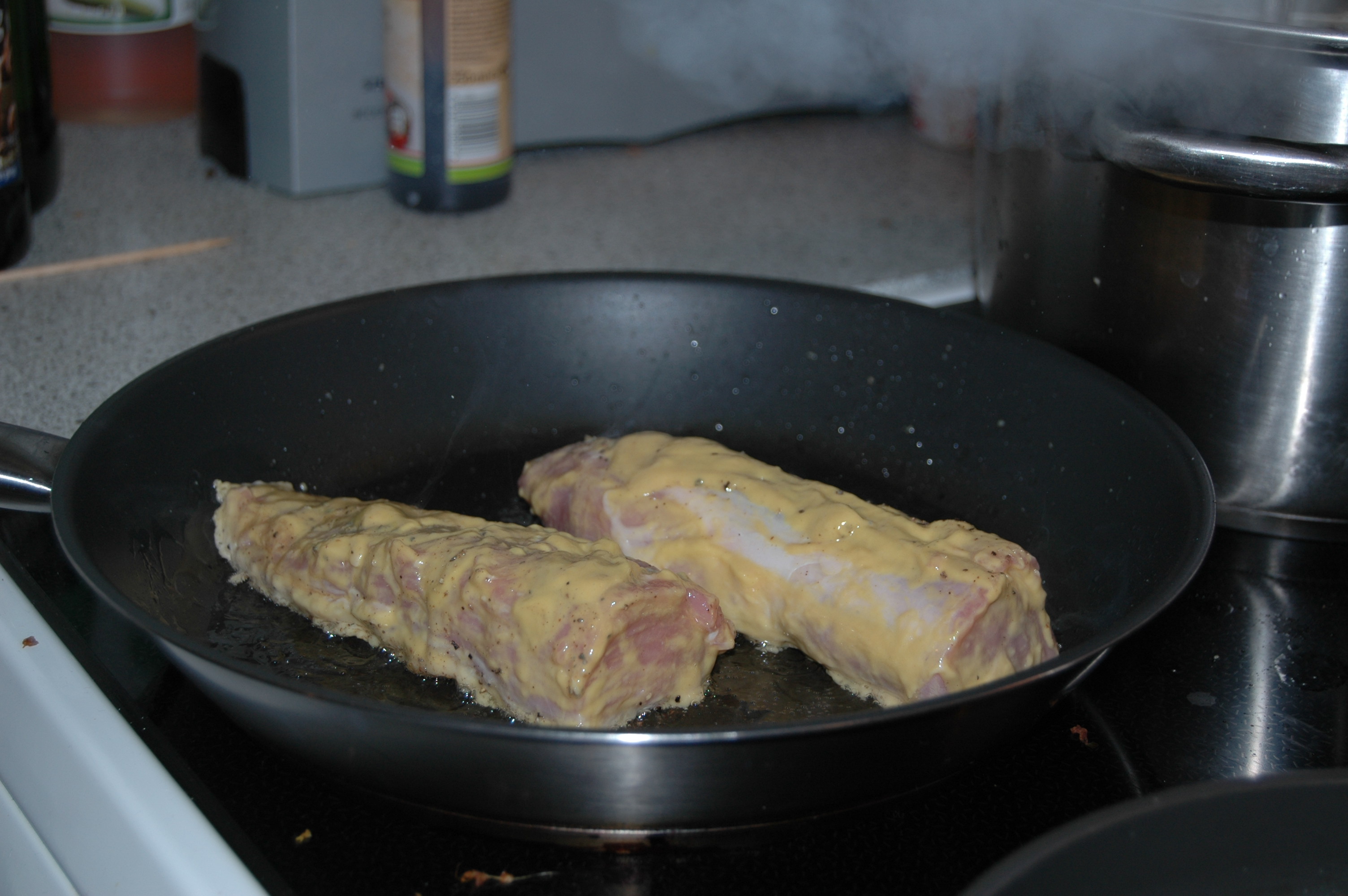 Brush one pork fillet with two tablespoons of mustard.Sear the meat in a pan with one tablespoon of vegetable oil.