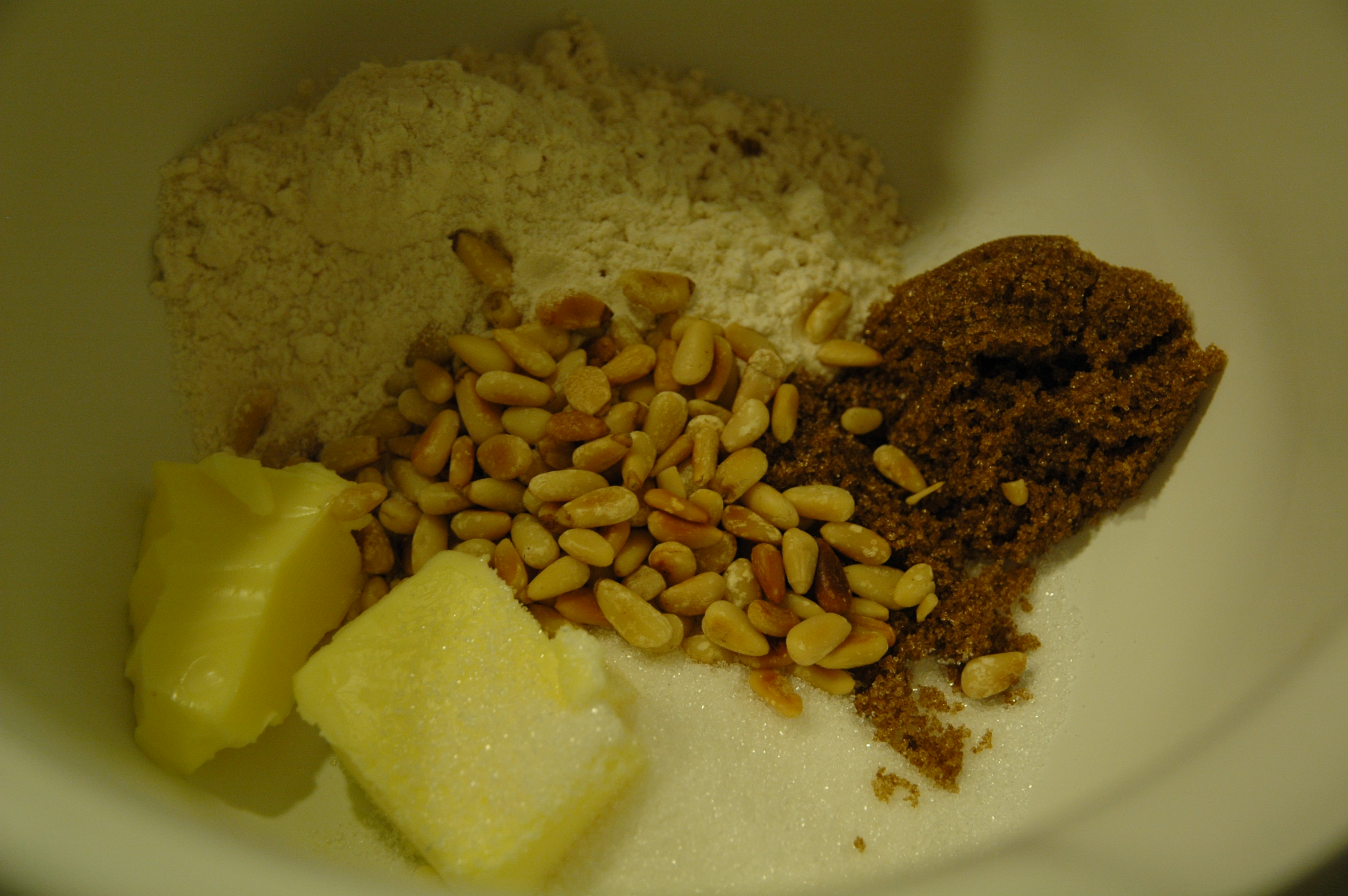 Mix 50 grams of butter, 60 grams of flour, 30 grams of sugar, 30 grams of brown sugar and the roasted pine nuts. Crumbles