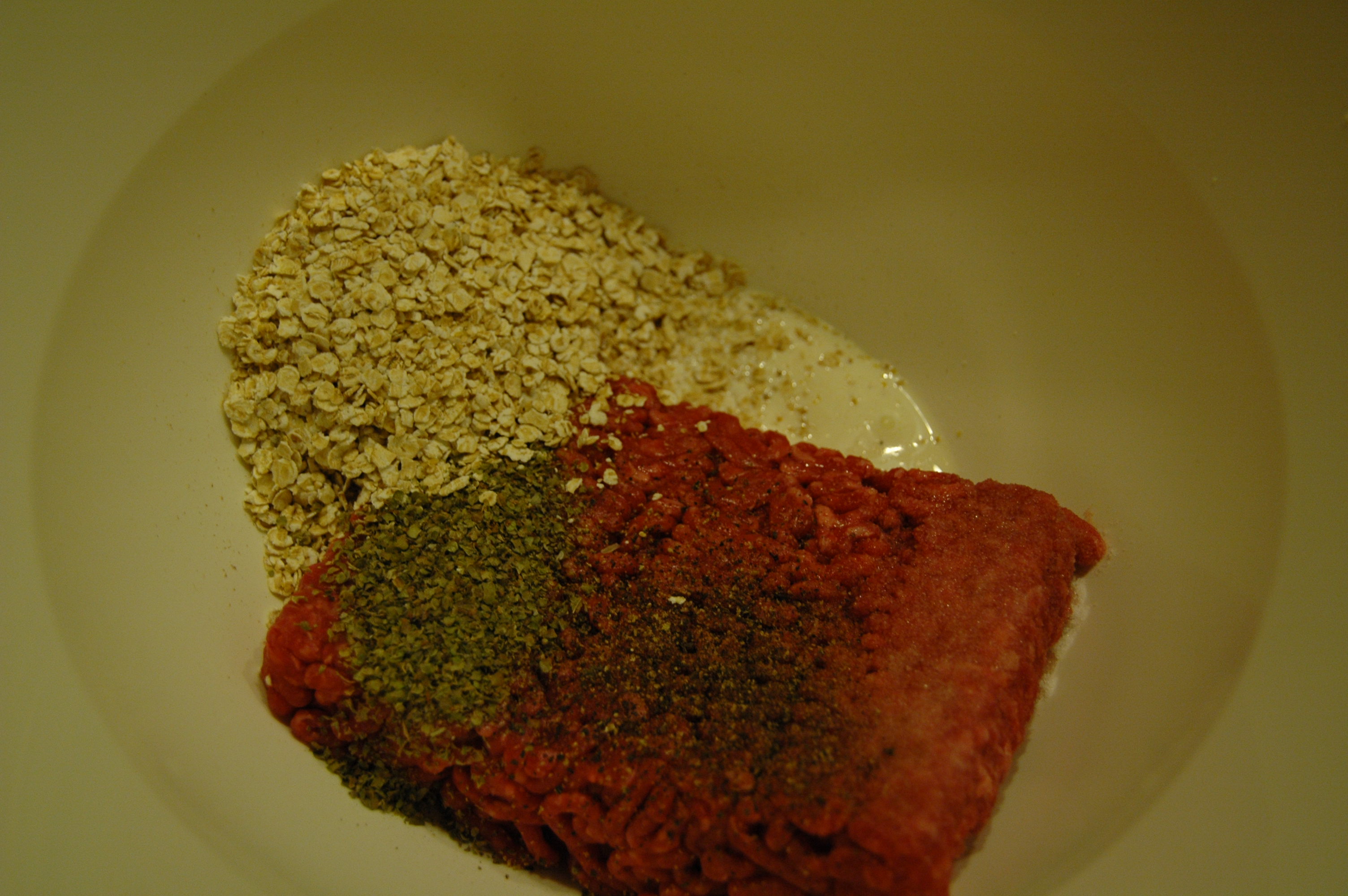 Mix 400 grams of minced meat, 50 grams of oatmeal, 100 millilitres of cream, one teaspoon of oregano and one teaspoon of salt and pepper. Meat and Oatmeal