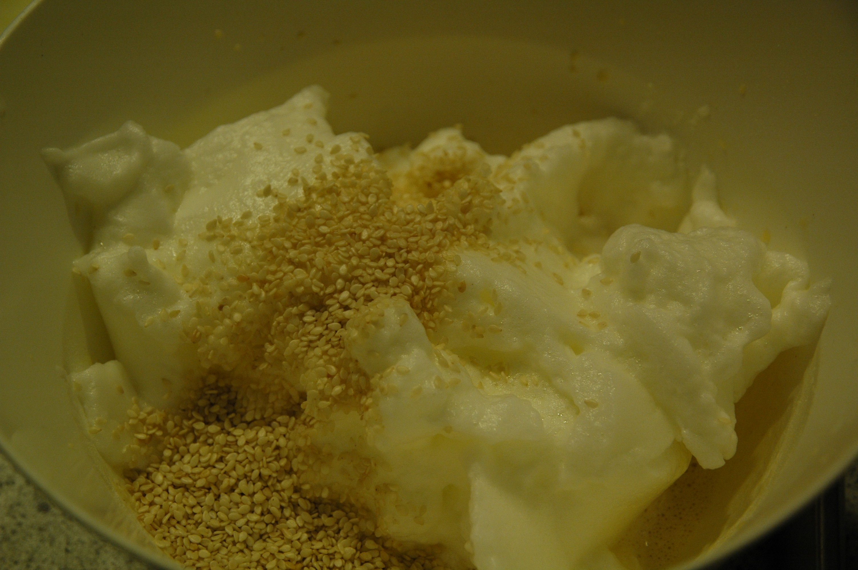 Egg Whites and Sesame Fold in two whipped egg whites and five tablespoons of sesame seeds.