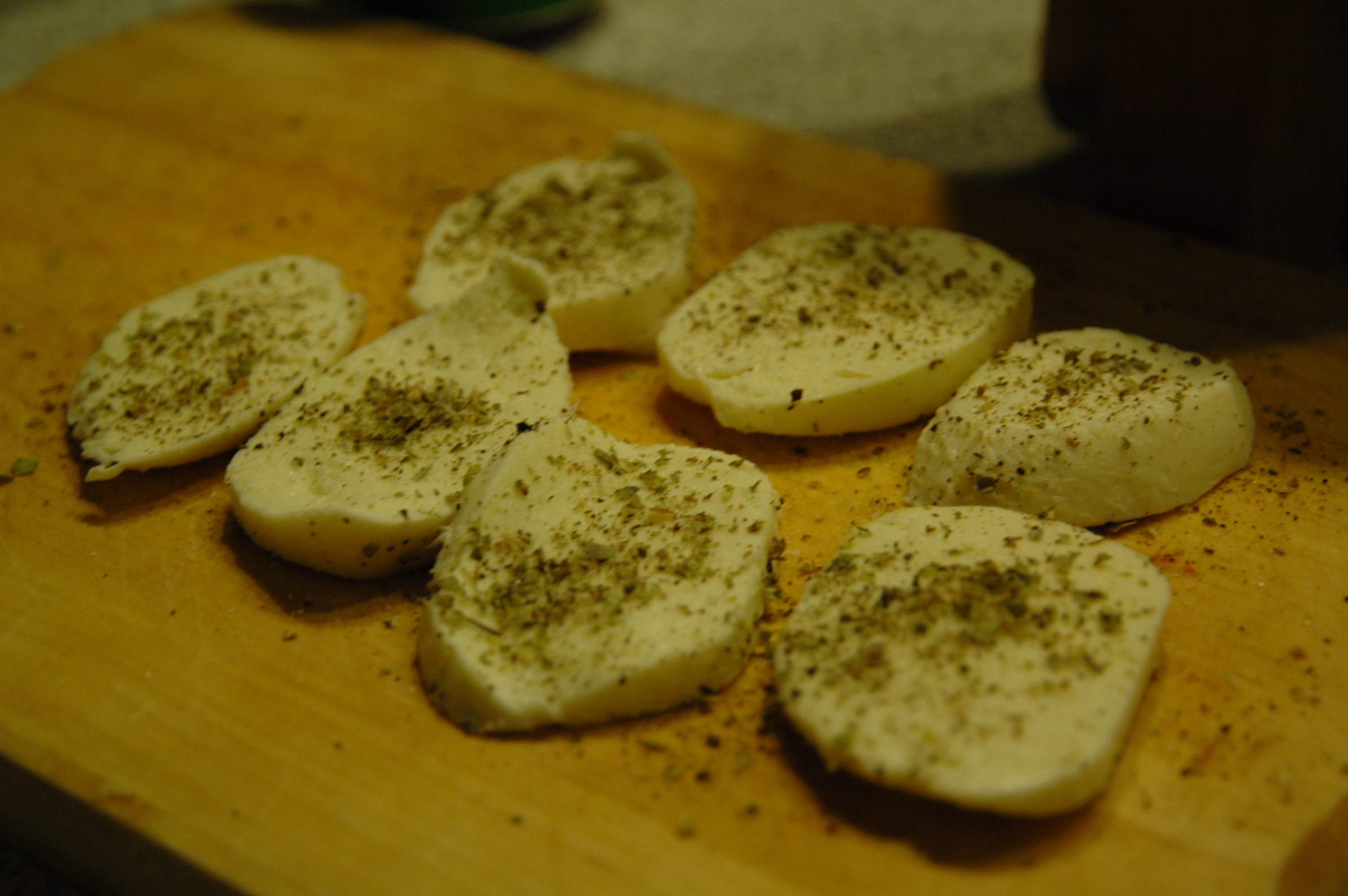 Cut two mozzarella balls into 14 slices and spice them with marjoram, salt and pepper. Spiced Mozzarella Slices