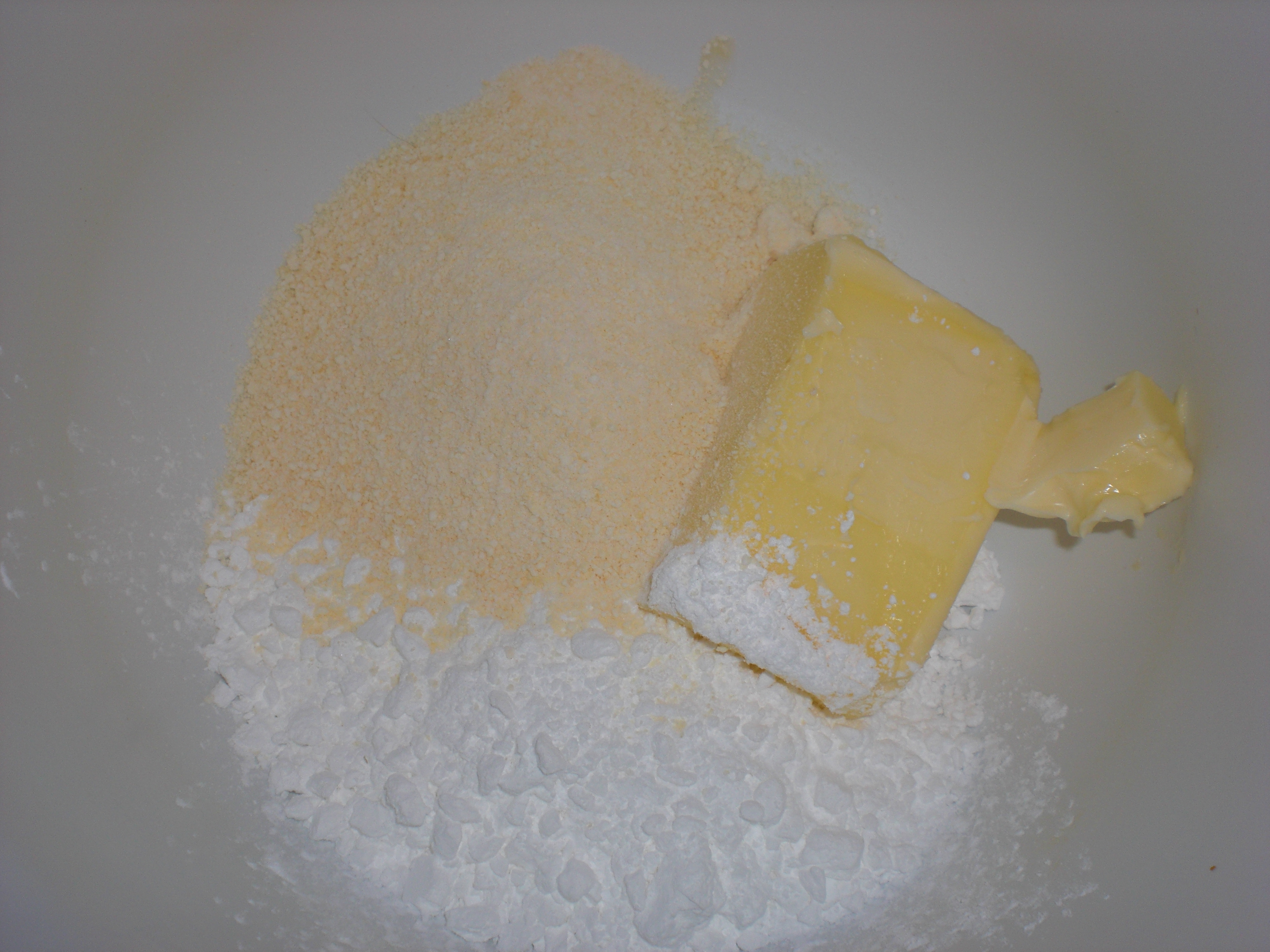 | Whisk 125 grams of butter, 125 grams of icing sugar and 50 grams of white cocoa together. |