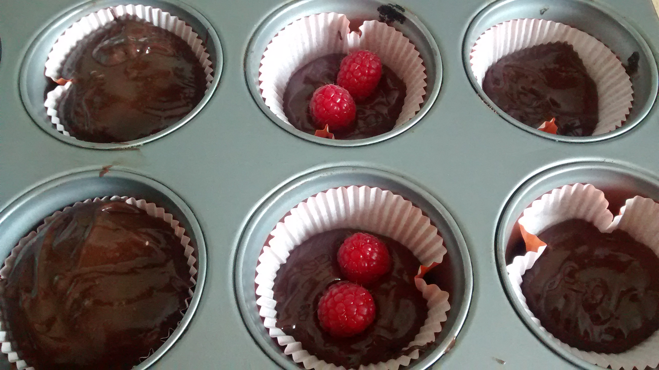 raspberry Line 24 muffin tin cups with paper. Place one table spoon of dough in each. Add two raspberries to each (48 raspberries in total) and top with remaining dough.