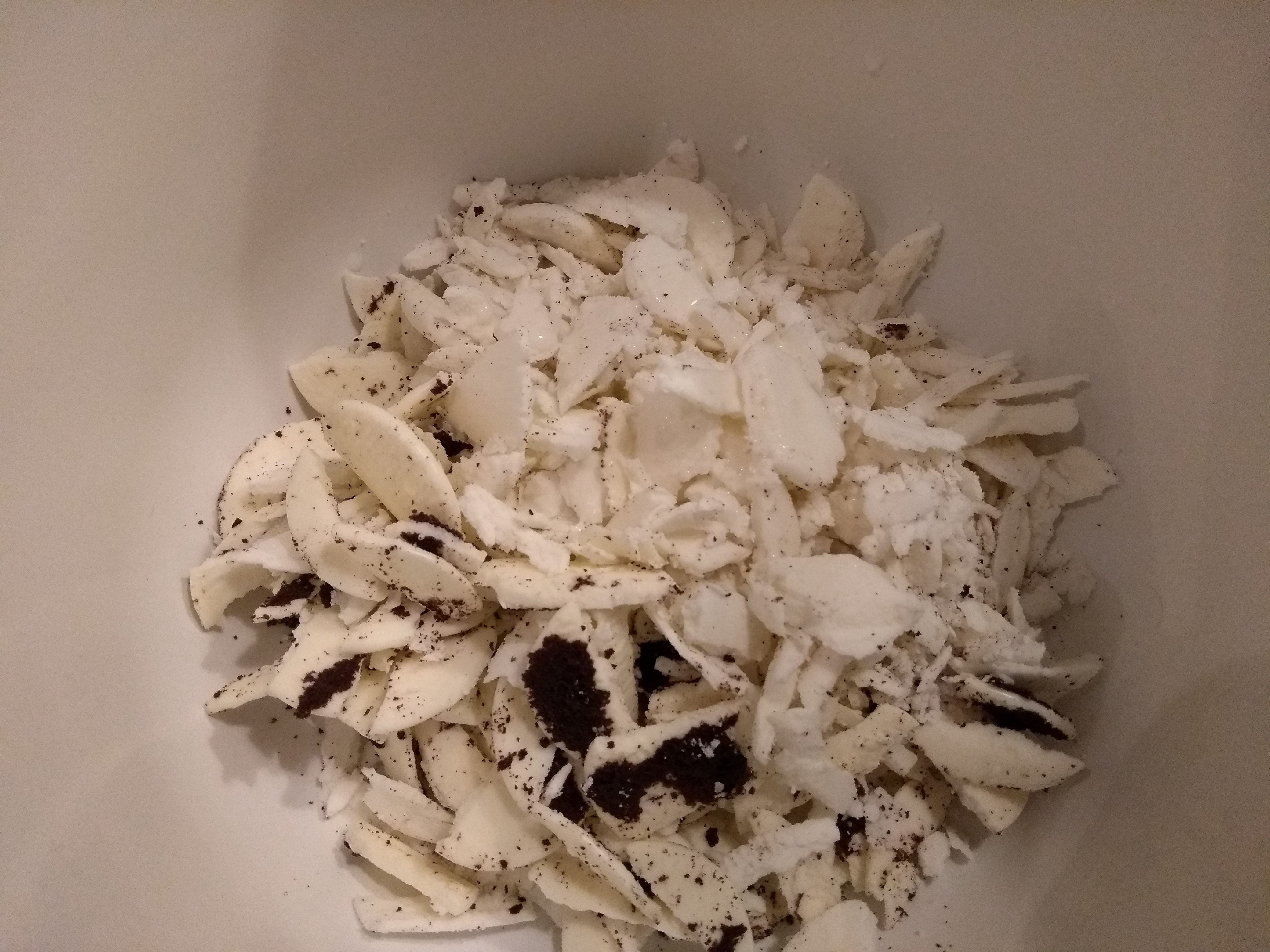oreo_halfed_cream Halve 50 Oreo biscuits. Set aside 36 halves with cream. Scrape off the remaining halves of the cream and set aside. Cut biscuits in half and set aside 72 half biscuit halves.