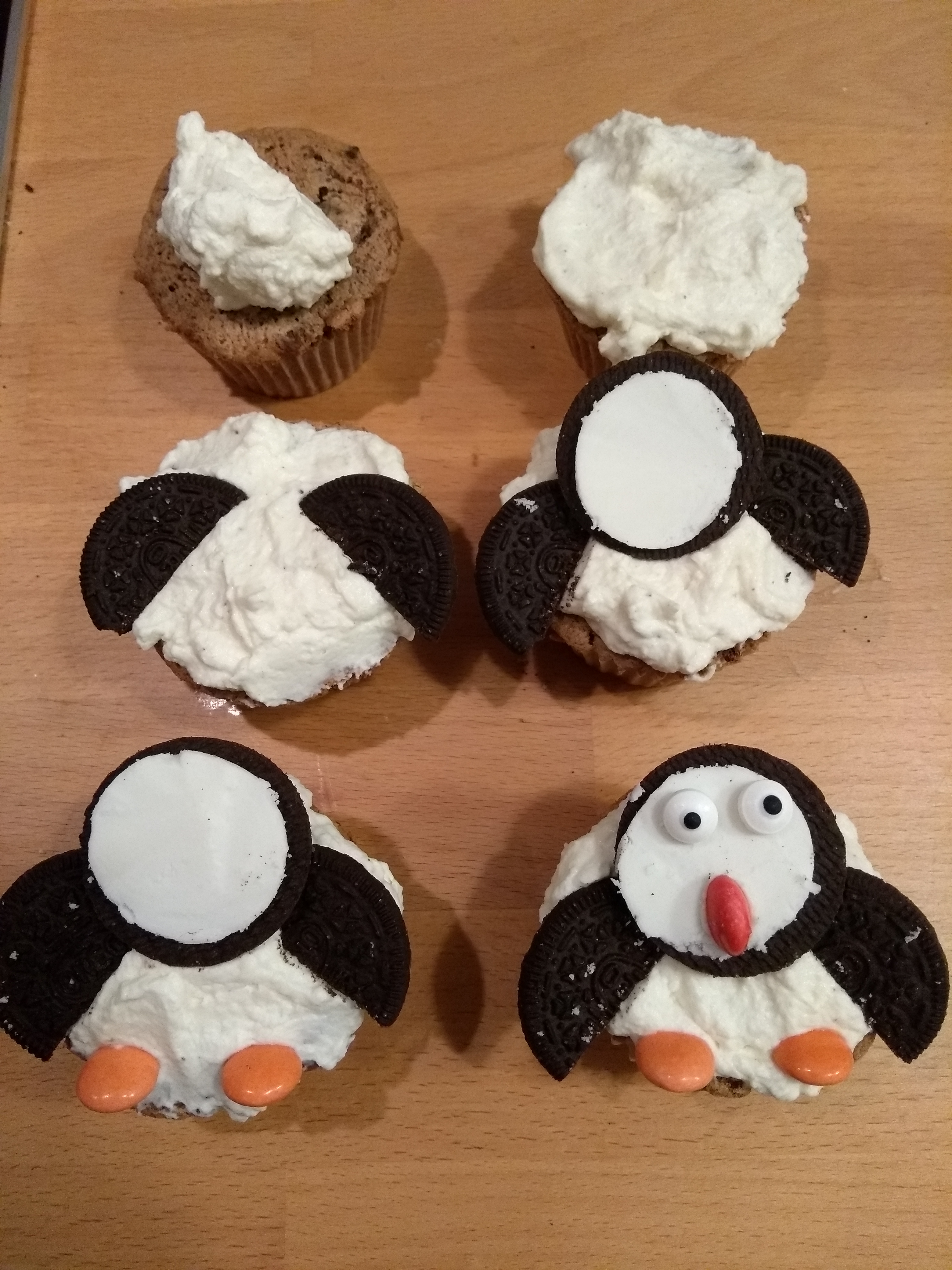 oreo_cupcake55 Place one tablespoon of topping on each cupcake and attach the Oreos as wings and faces. Decorate with 72 Smarties feets, with 36 halved Smarties noses and with 72 eyes.