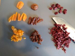 Cut 100 g of dried fruits (4 apricots, 3 figs, handful of cranberries) into fine dices.