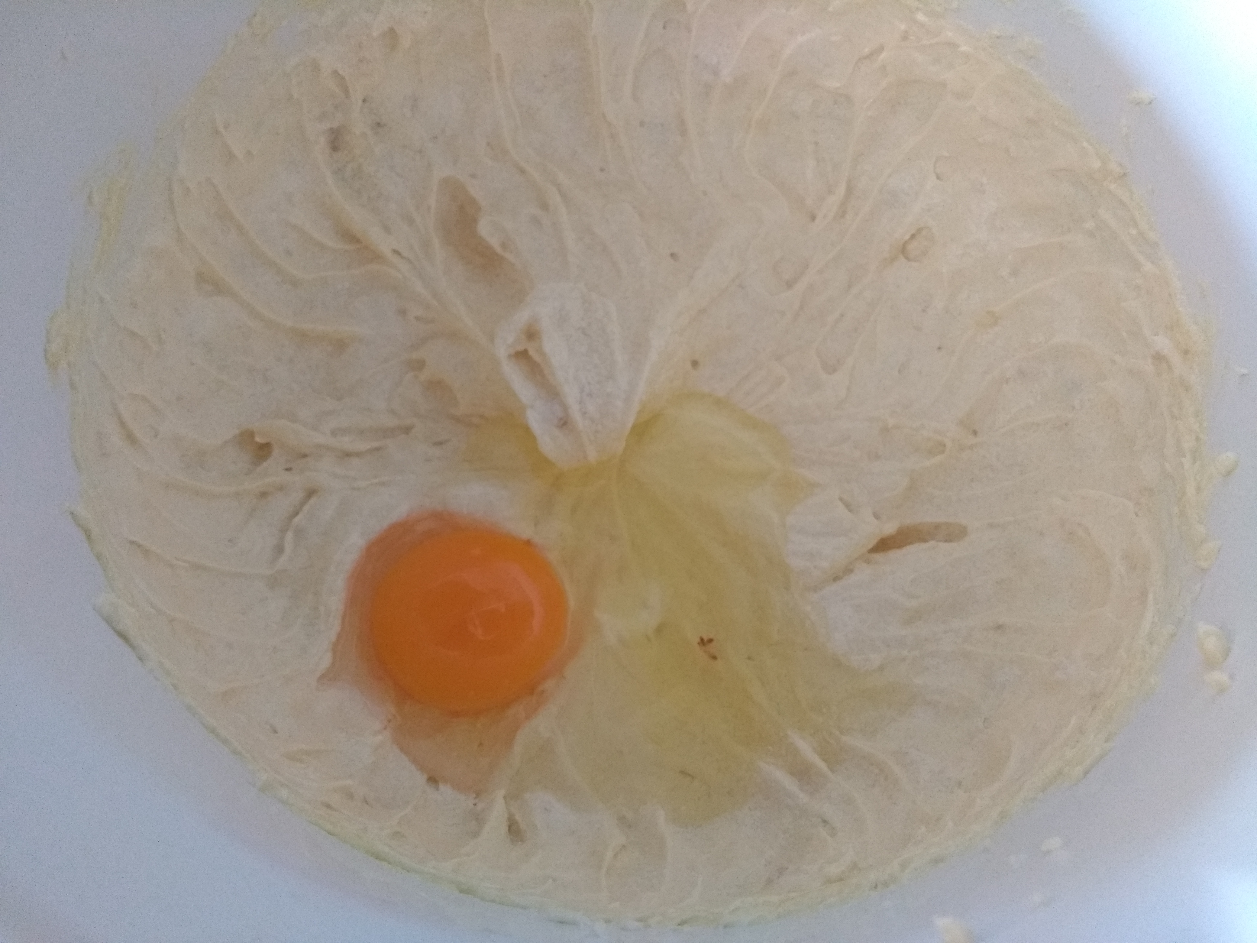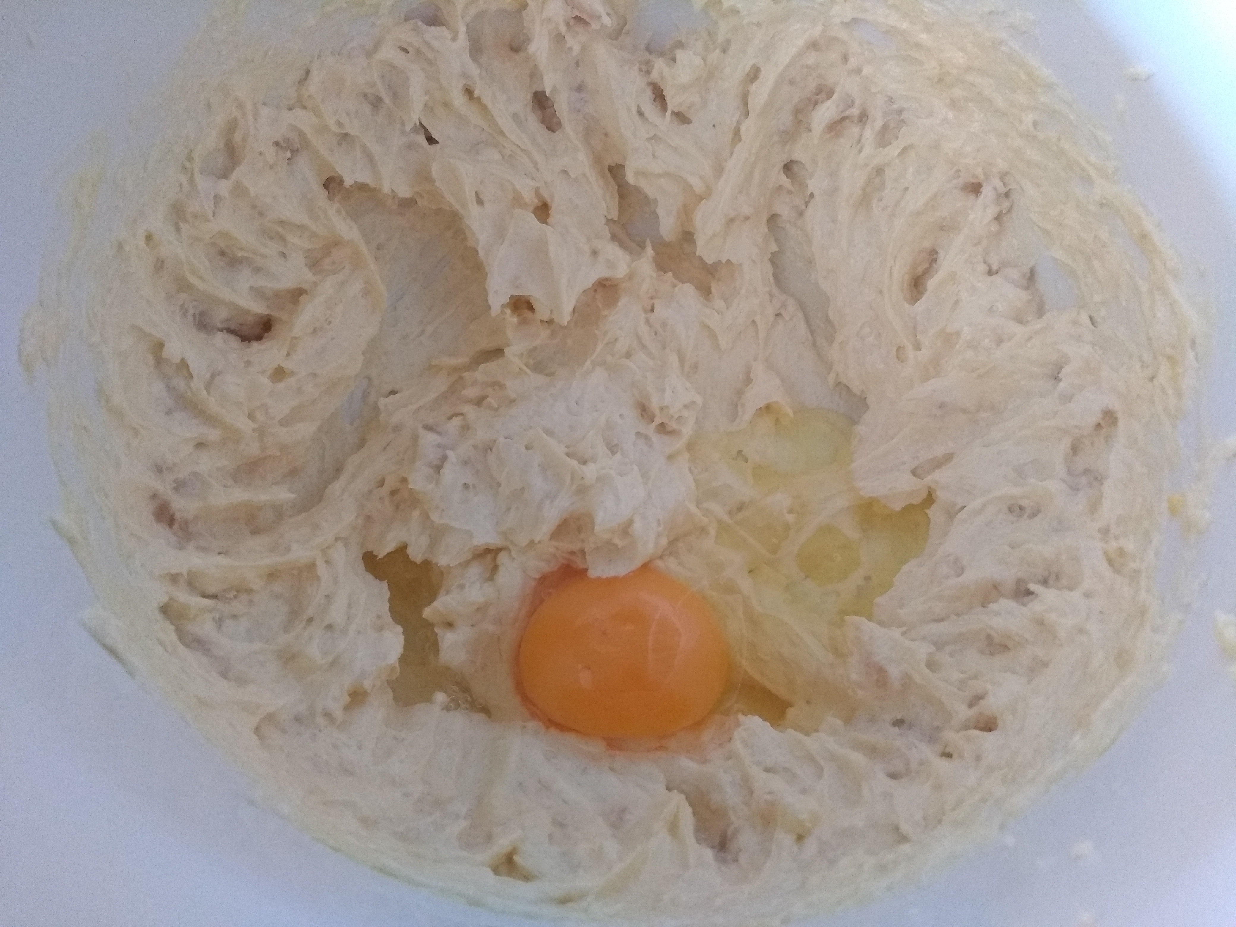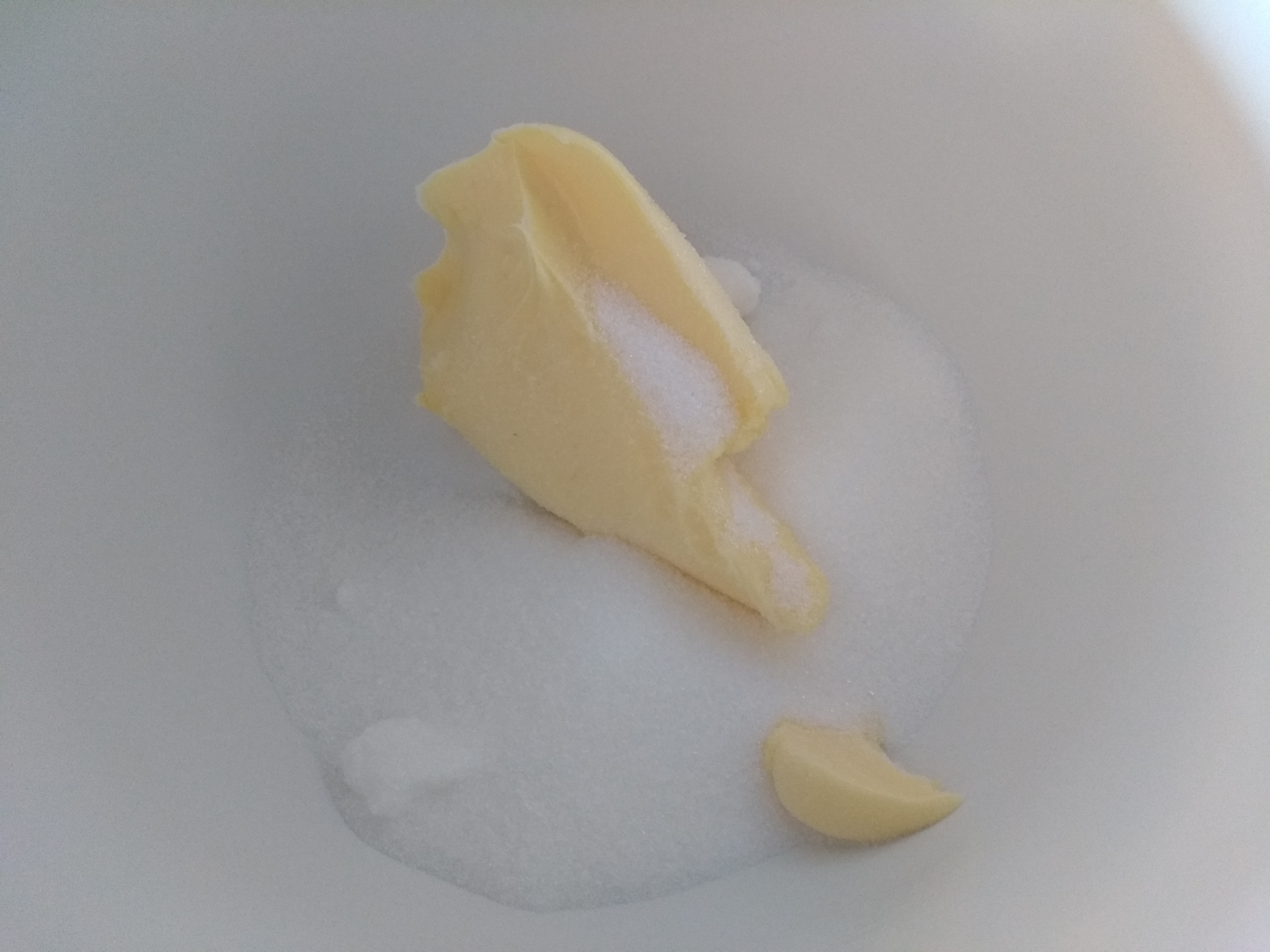 Whisk 100 g of margarine and 100 g of sugar until white and foamy.