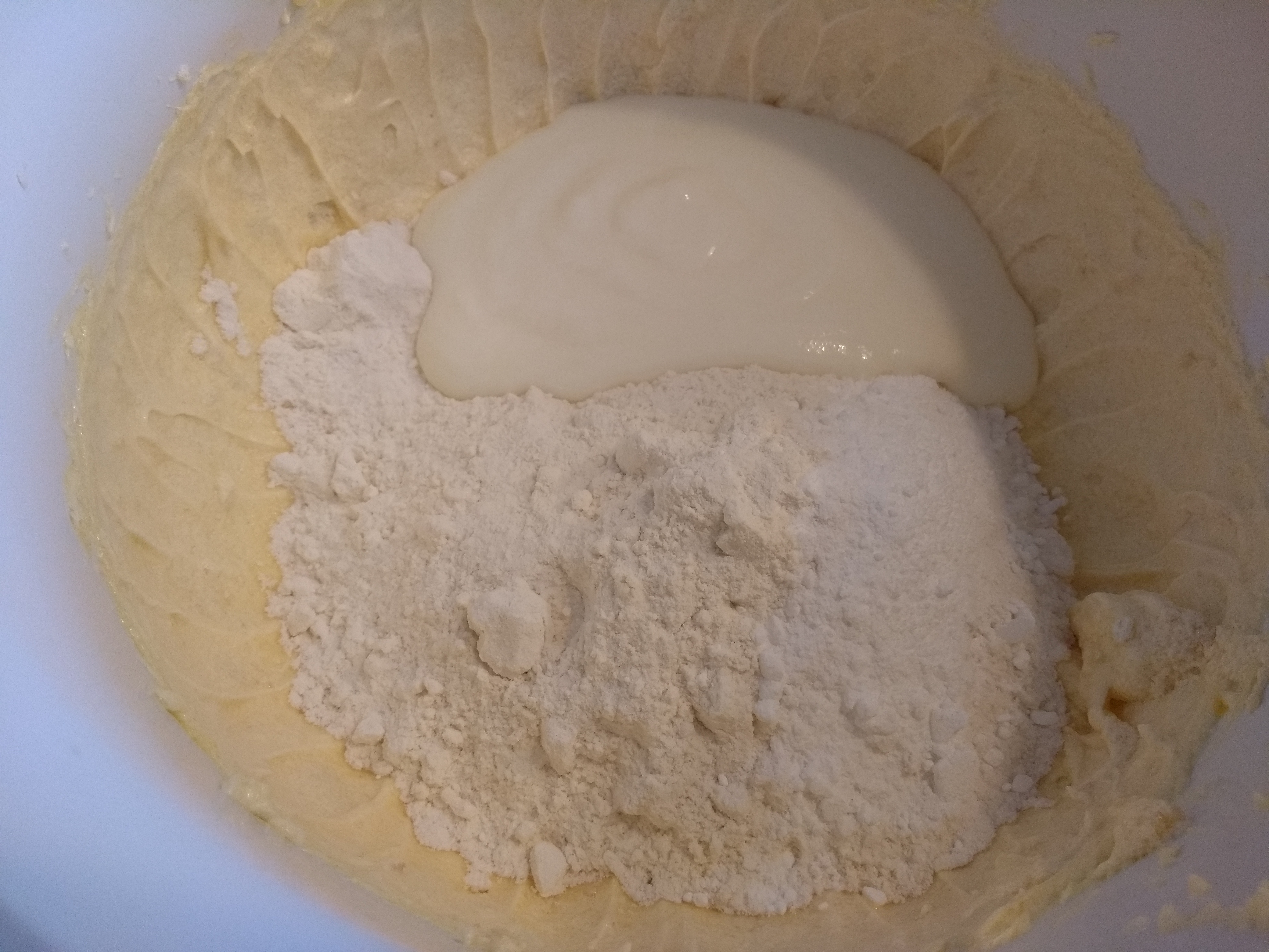 Add 150 g of flour, one teaspoons of baking powder and 100 ml of yogurt.