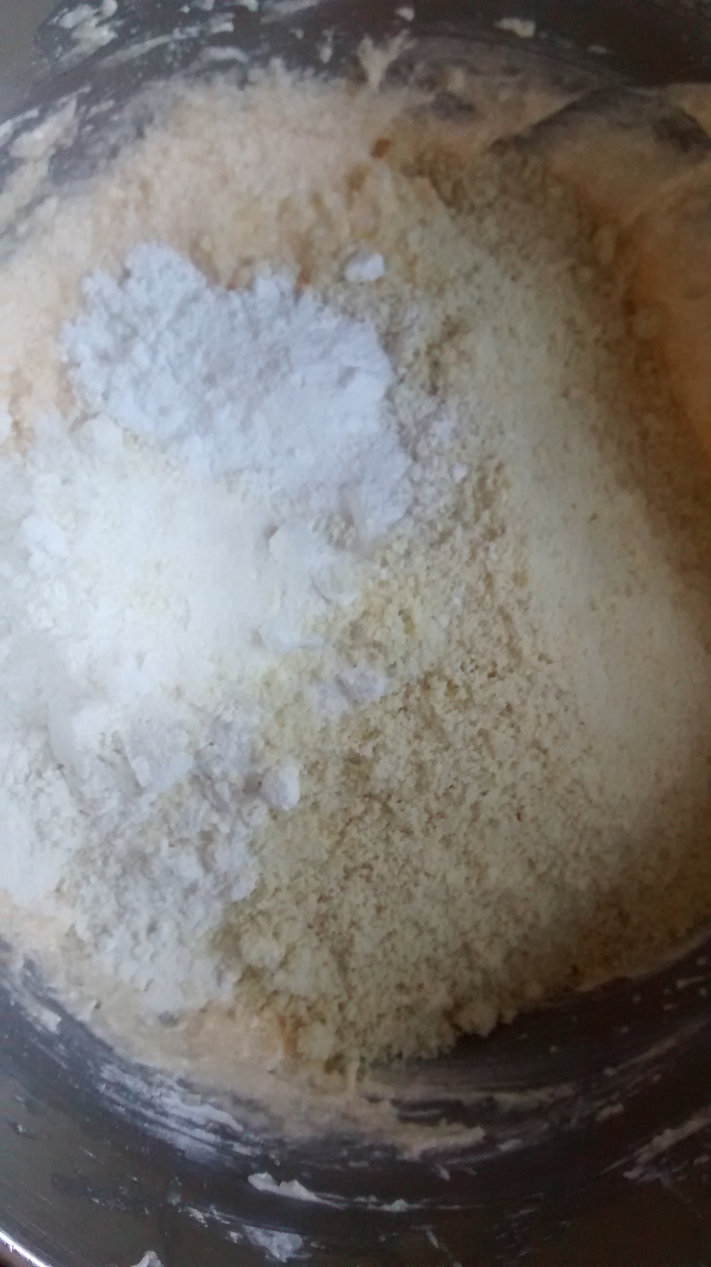 Fold in 120 grams of flour, 80 grams of starch, 100 grams of grounded almonds and one table spoon of baking powder.  almonds_flour