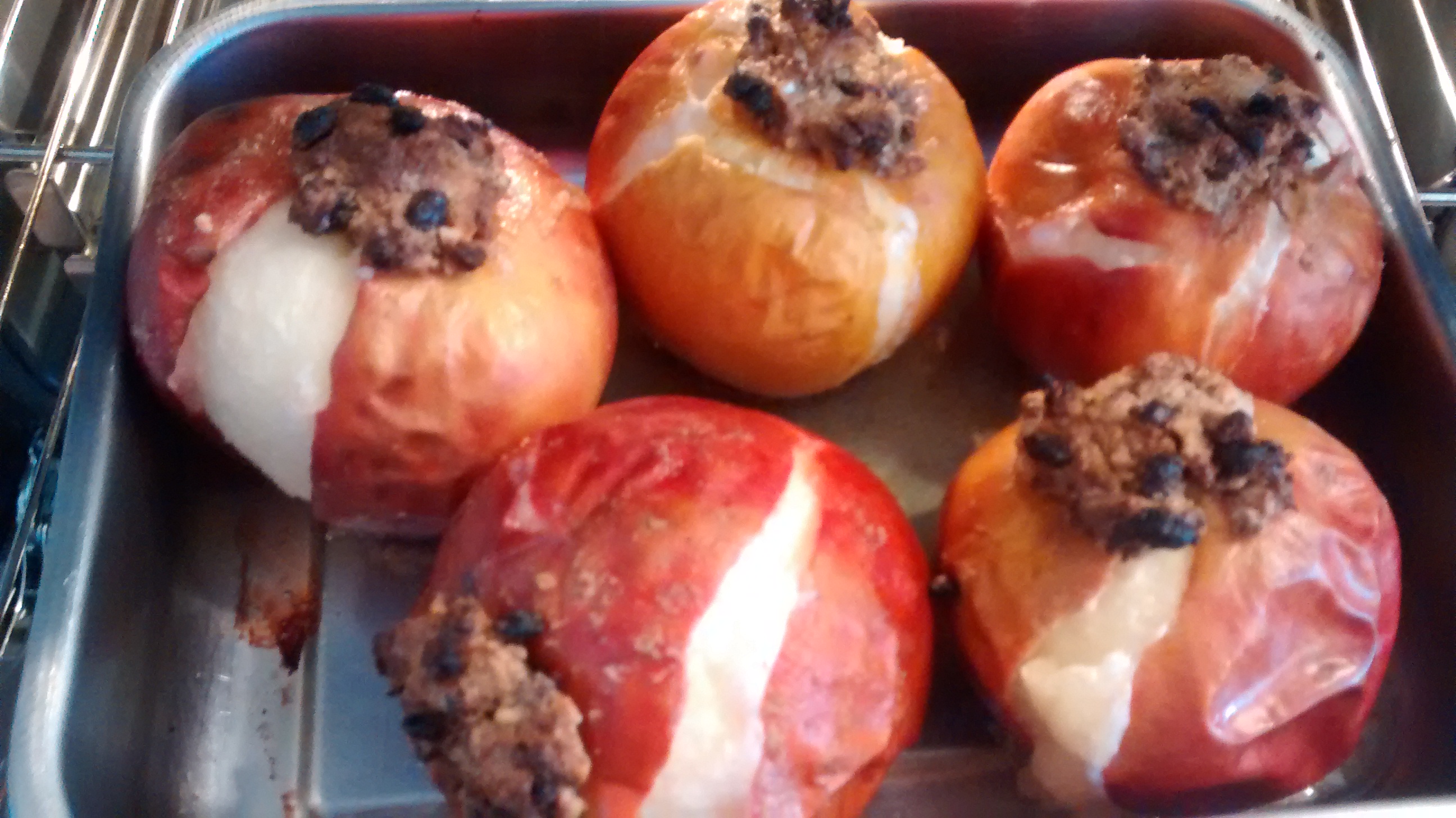 Knead the barberries with 70 grams chopped almonds, 70 grams marzipan and a pinch of cinnamon and fill in the apples.  almond_mixture