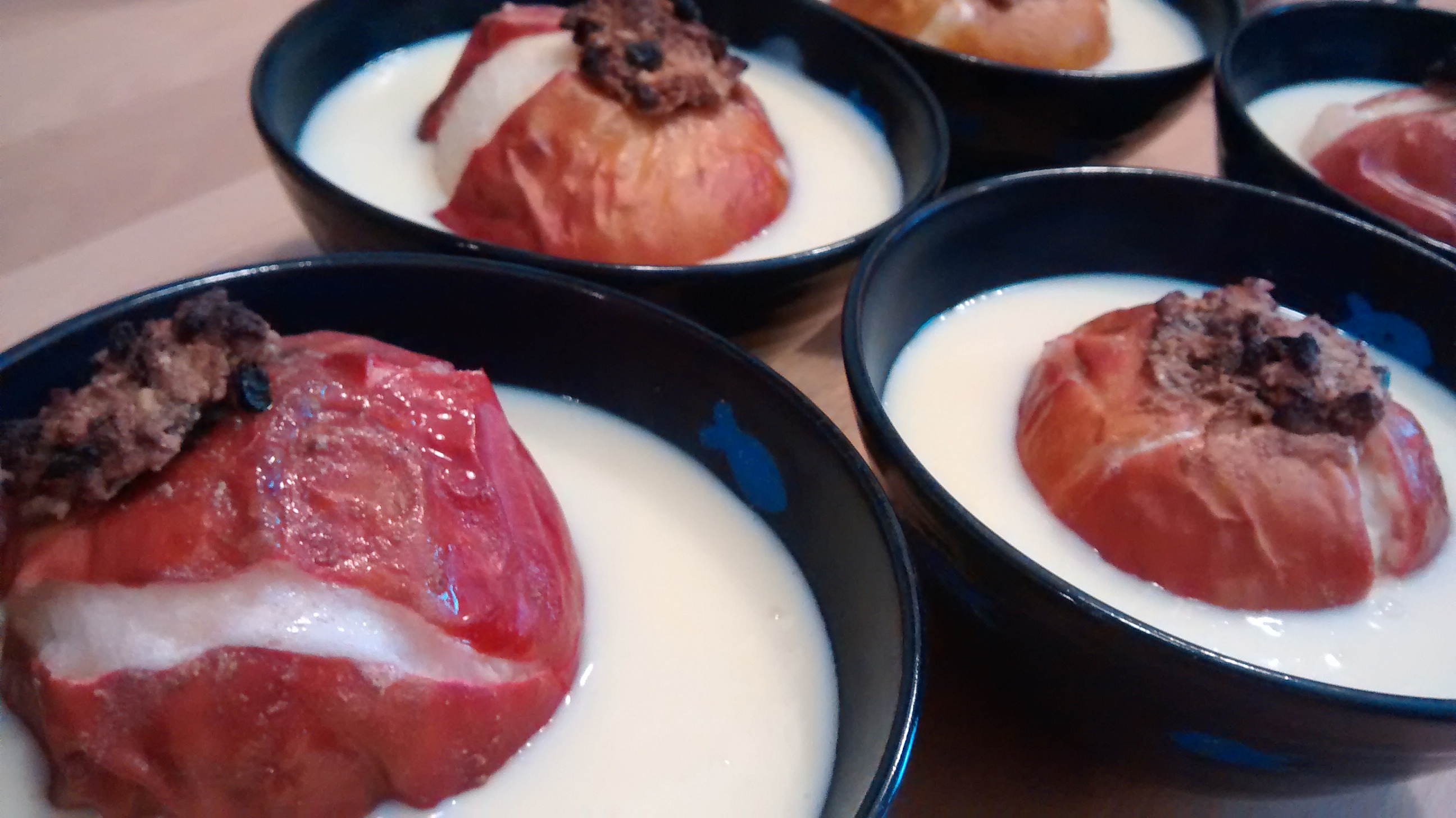 vanilla_sauce Cook a custard out of 750 ml of milk, 40 g of vanilla sugar and 40 g of starch and serve with the baked apples.