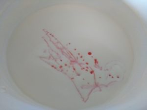 In a flat bowl place one third of the milk rice,  half of the strawberry puree and half of the strawberry dice.