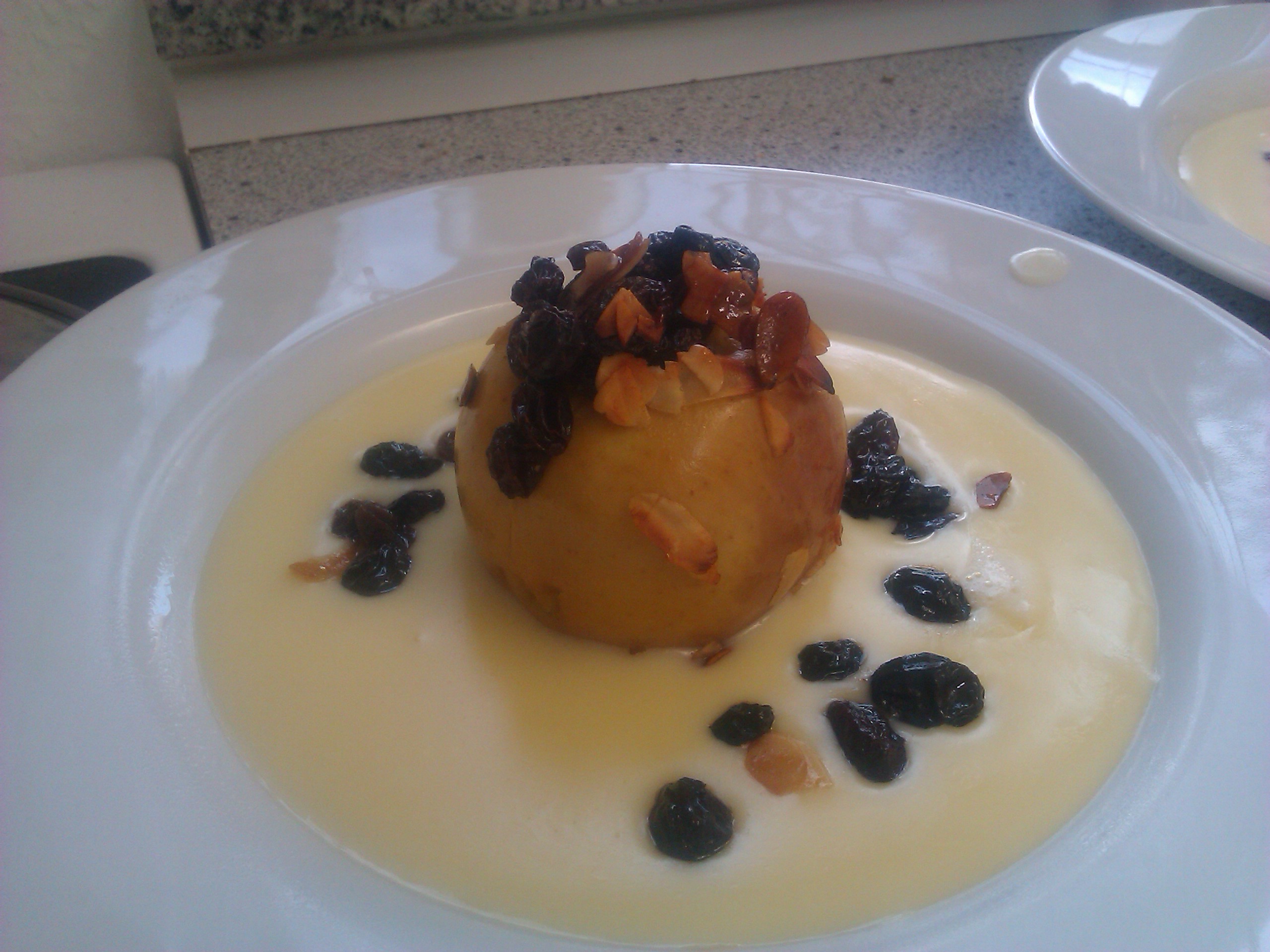 Core two sour apples with a apple corer and fill the apples with the raisin mixture. Put the apples in a oven dish and bake for 30 minutes at 200 degrees Celsius.
