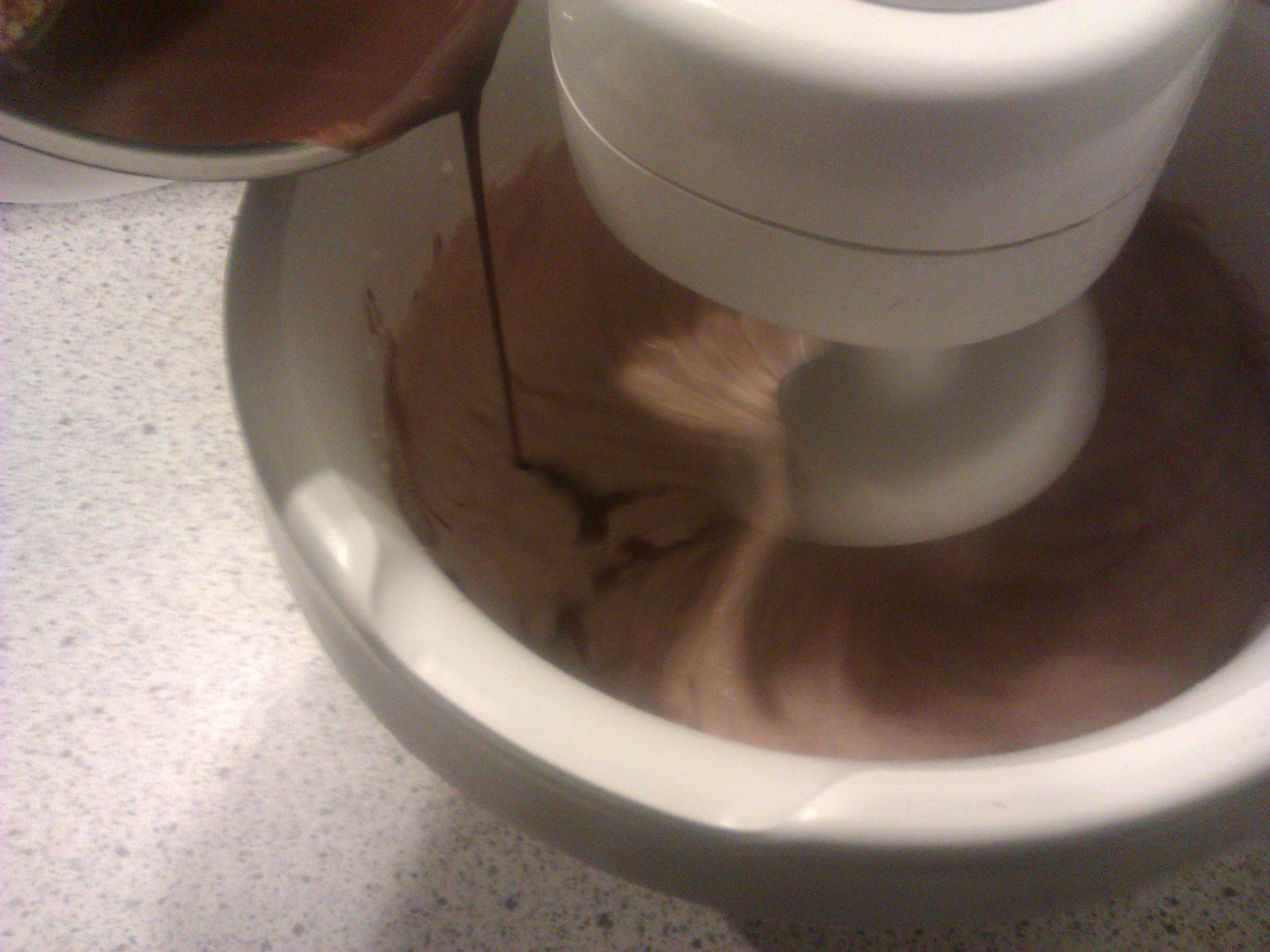 Gradually add 350 grams of plain flour, 30 grams of vanilla sugar, 1 tablespoon of backing powder and 125 ml of water.