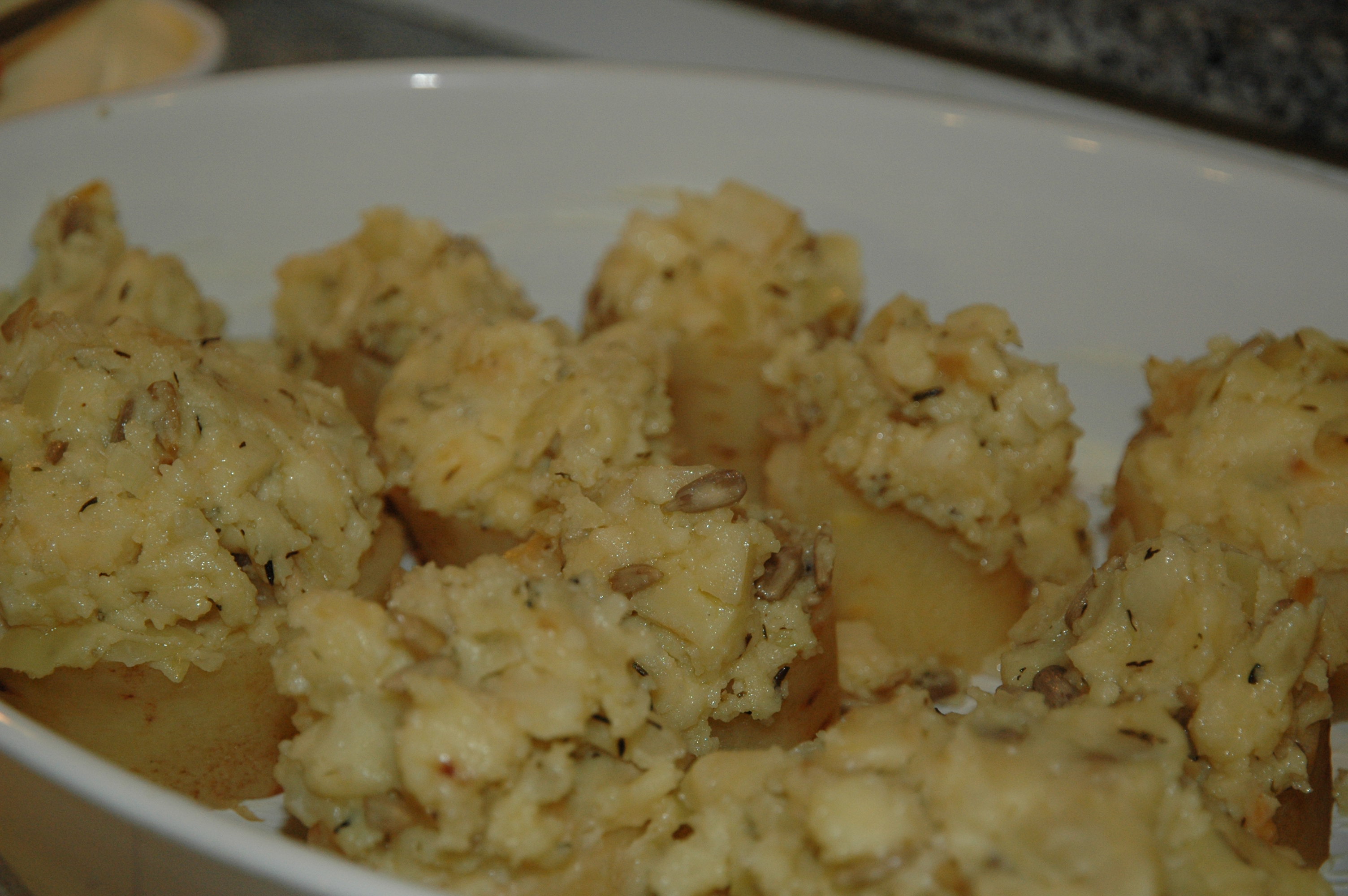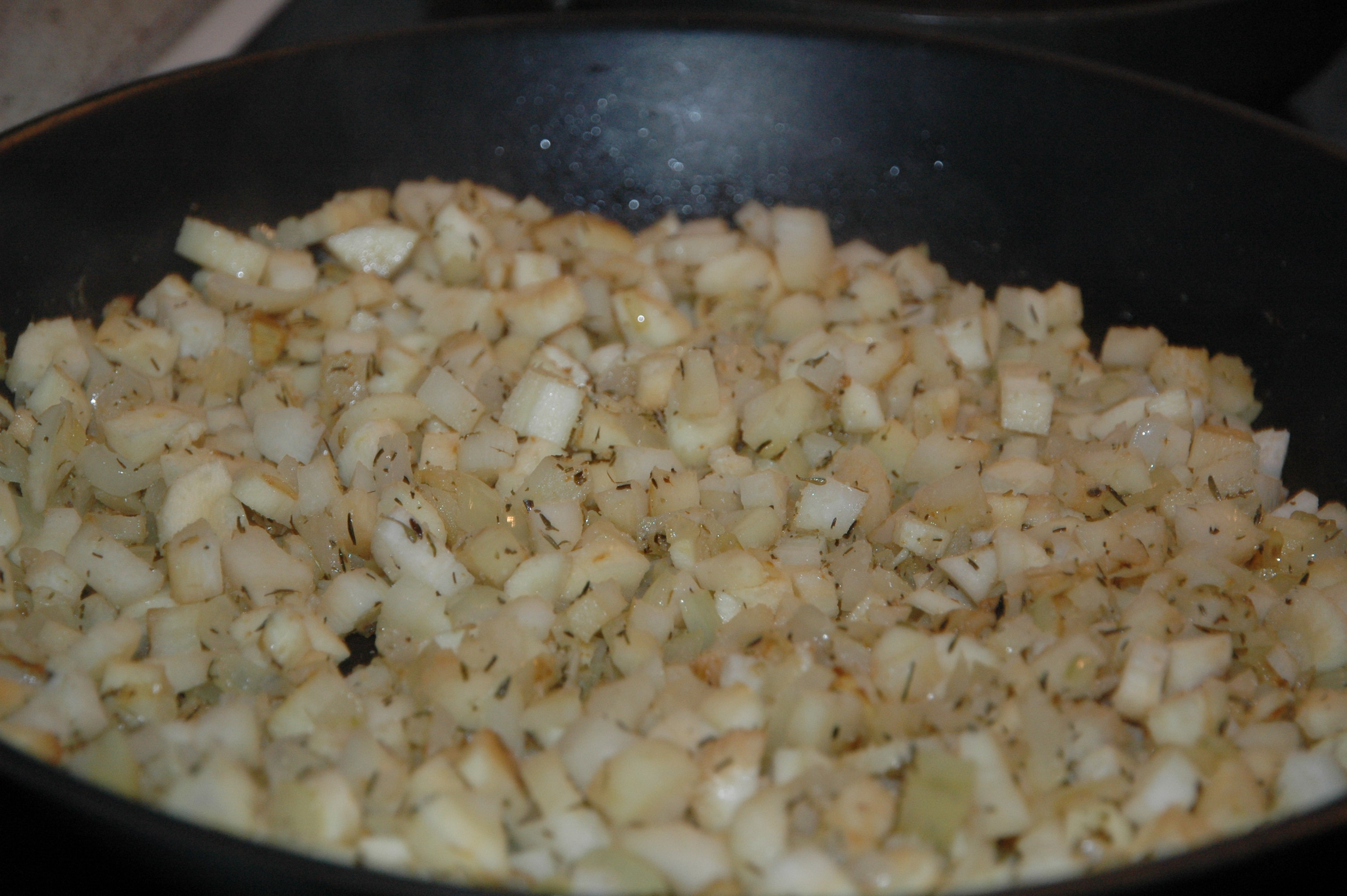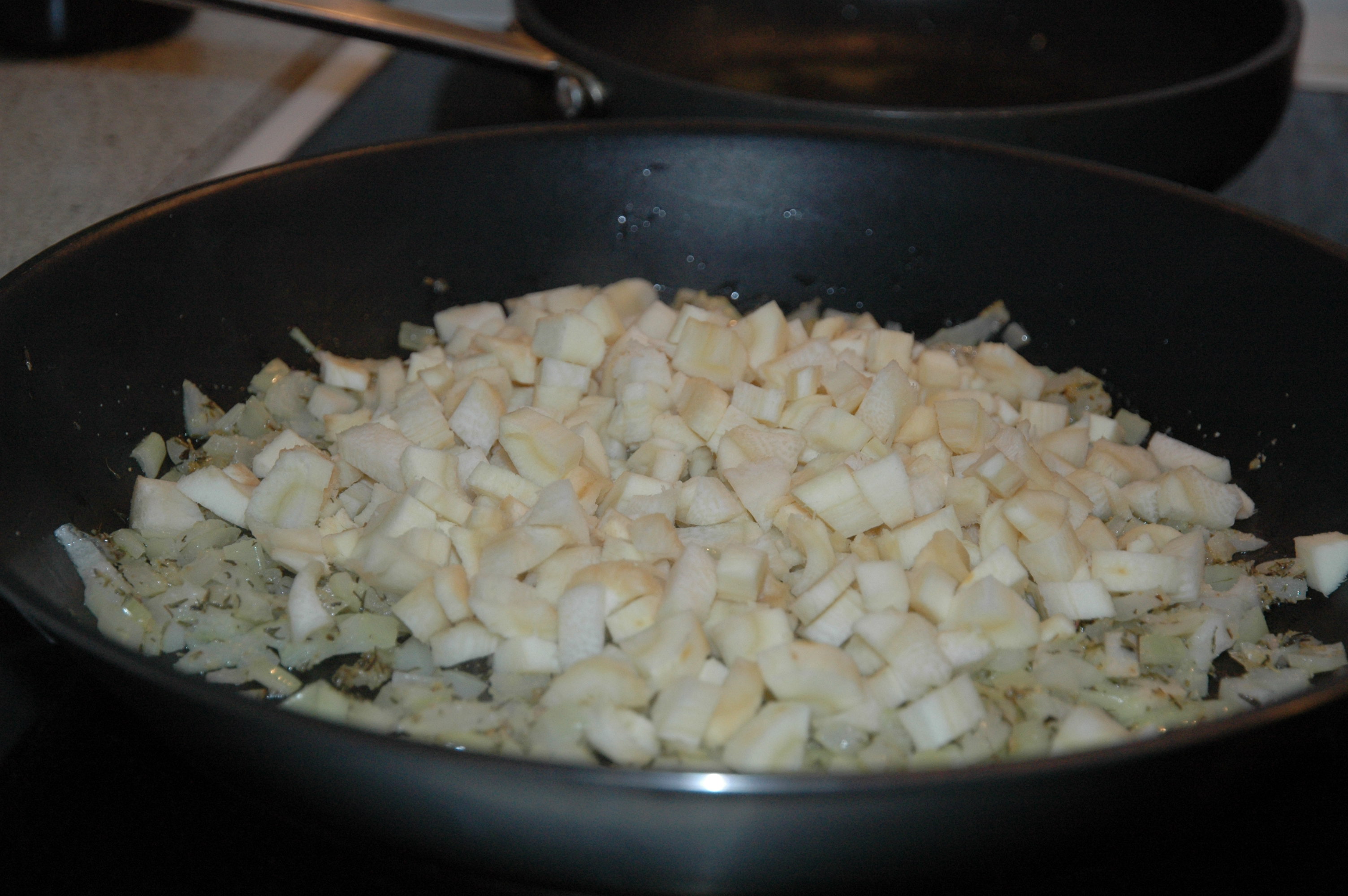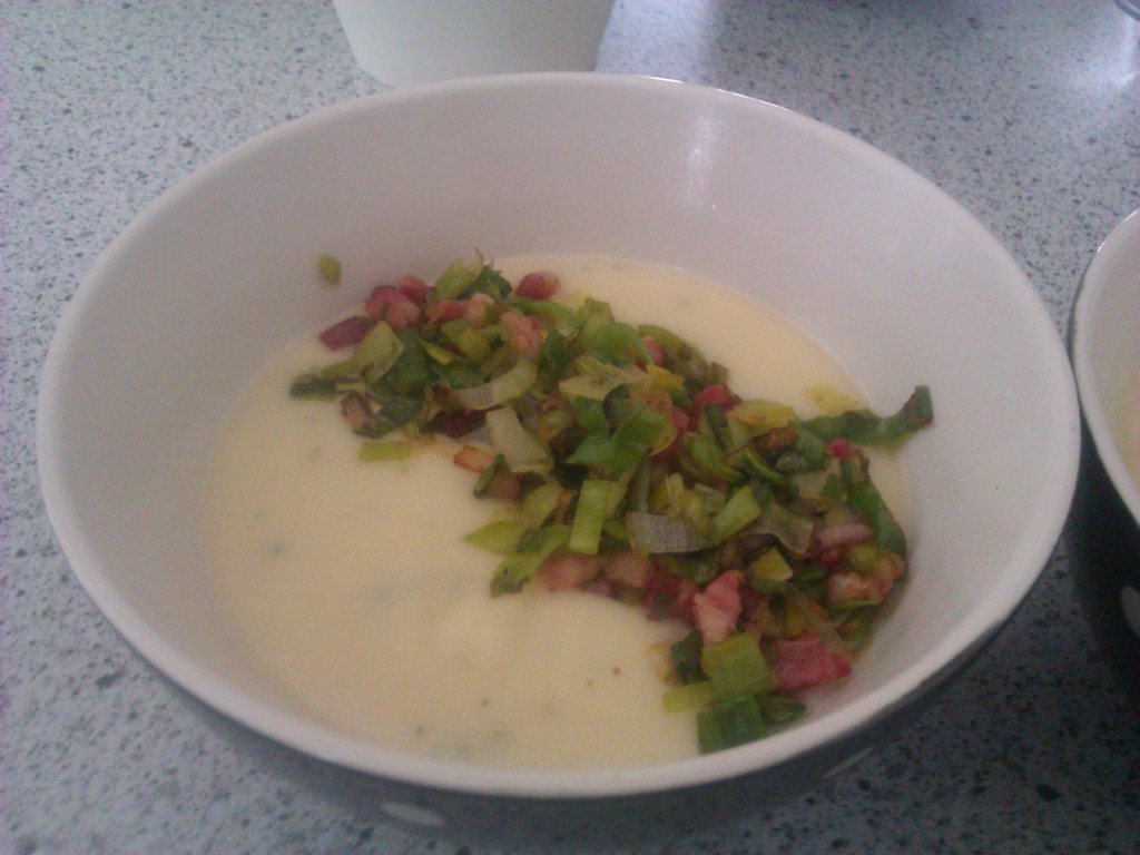 In a small pan roast 250 grams of diced bacon and add one sliced leek and a pinch of cumin, salt and pepper. Cook it for about 15 minutes.