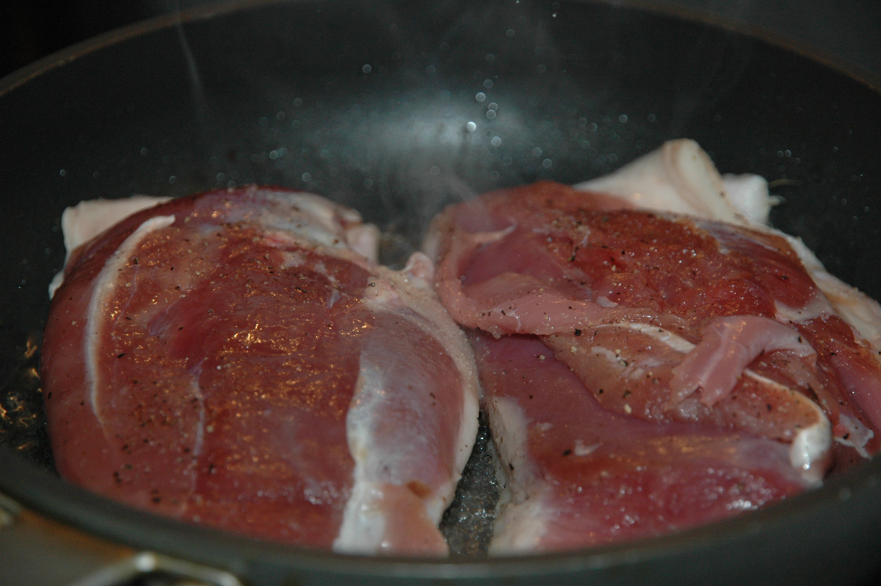Wash and dry two duck breasts. Gash the skin and spice them with salt and pepper. |
