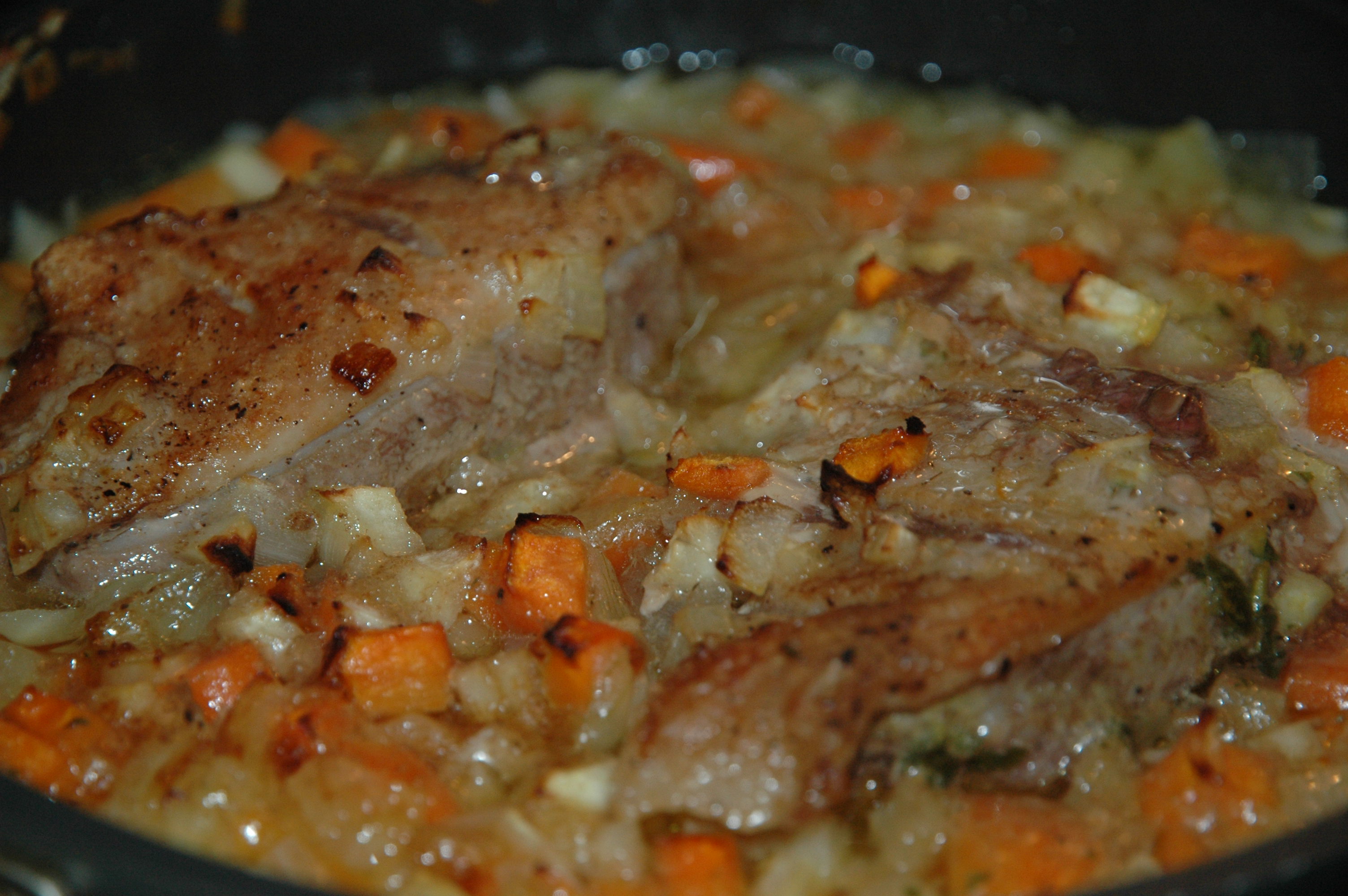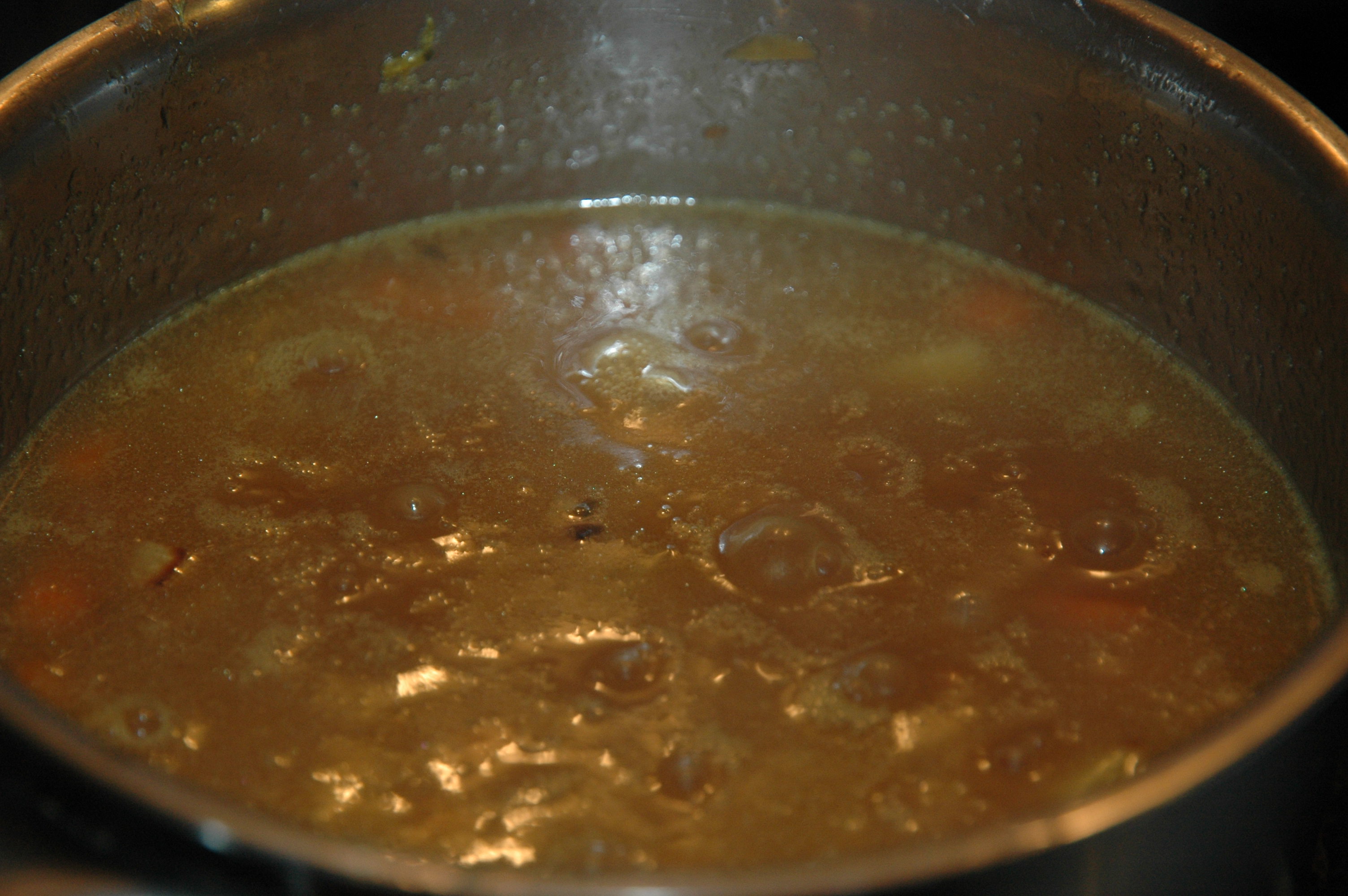 | Add the flour mixture, one tablespoon of balsamic vinegar and the vegetables and stock to the orange sirup and bring the sauce to a boil. |
