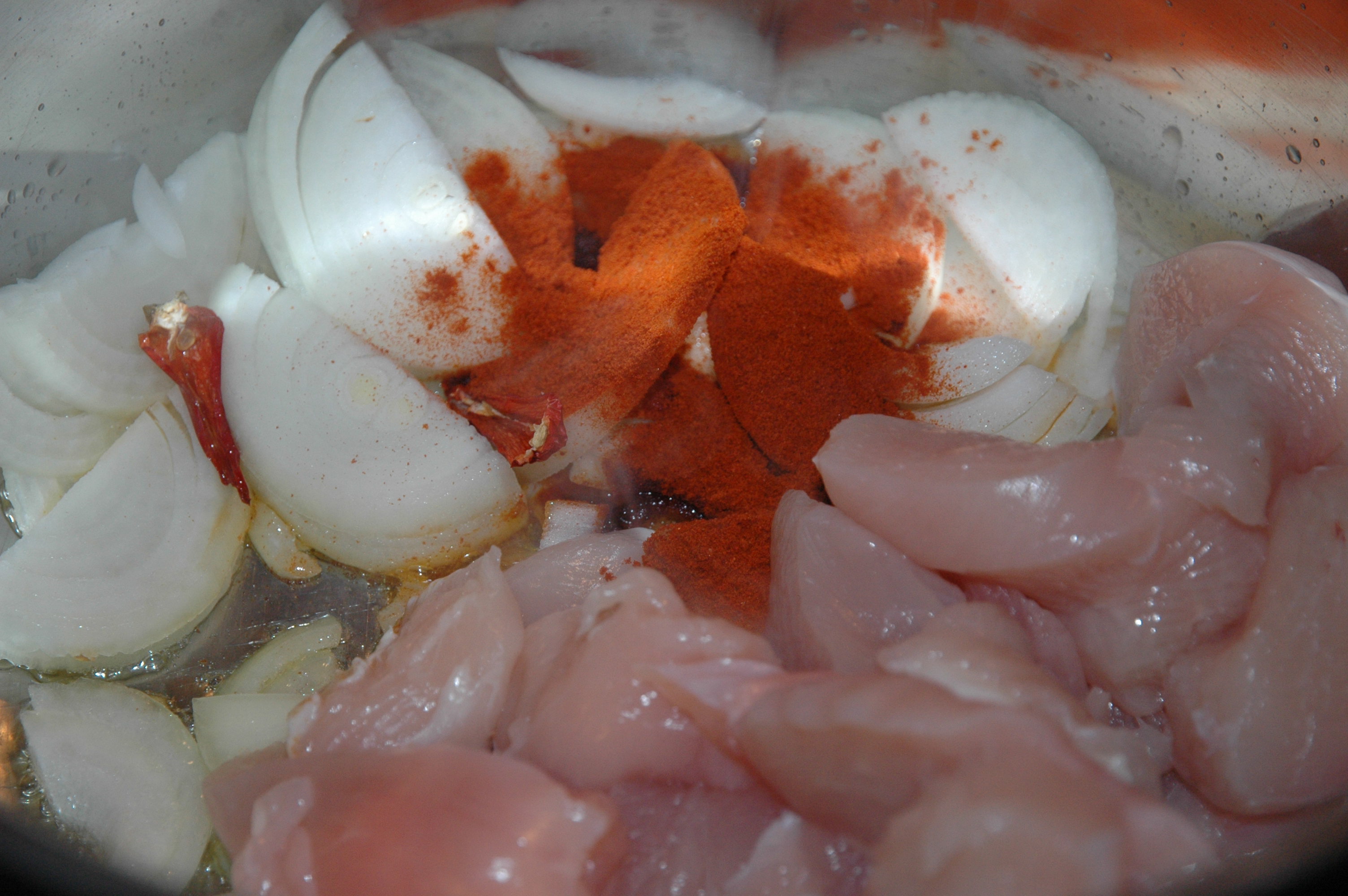 Roast the sliced onion, two sliced chicken breasts and one tablespoon of paprika in one tablespoon of vegetable oil. Onion, Chicken and Paprika