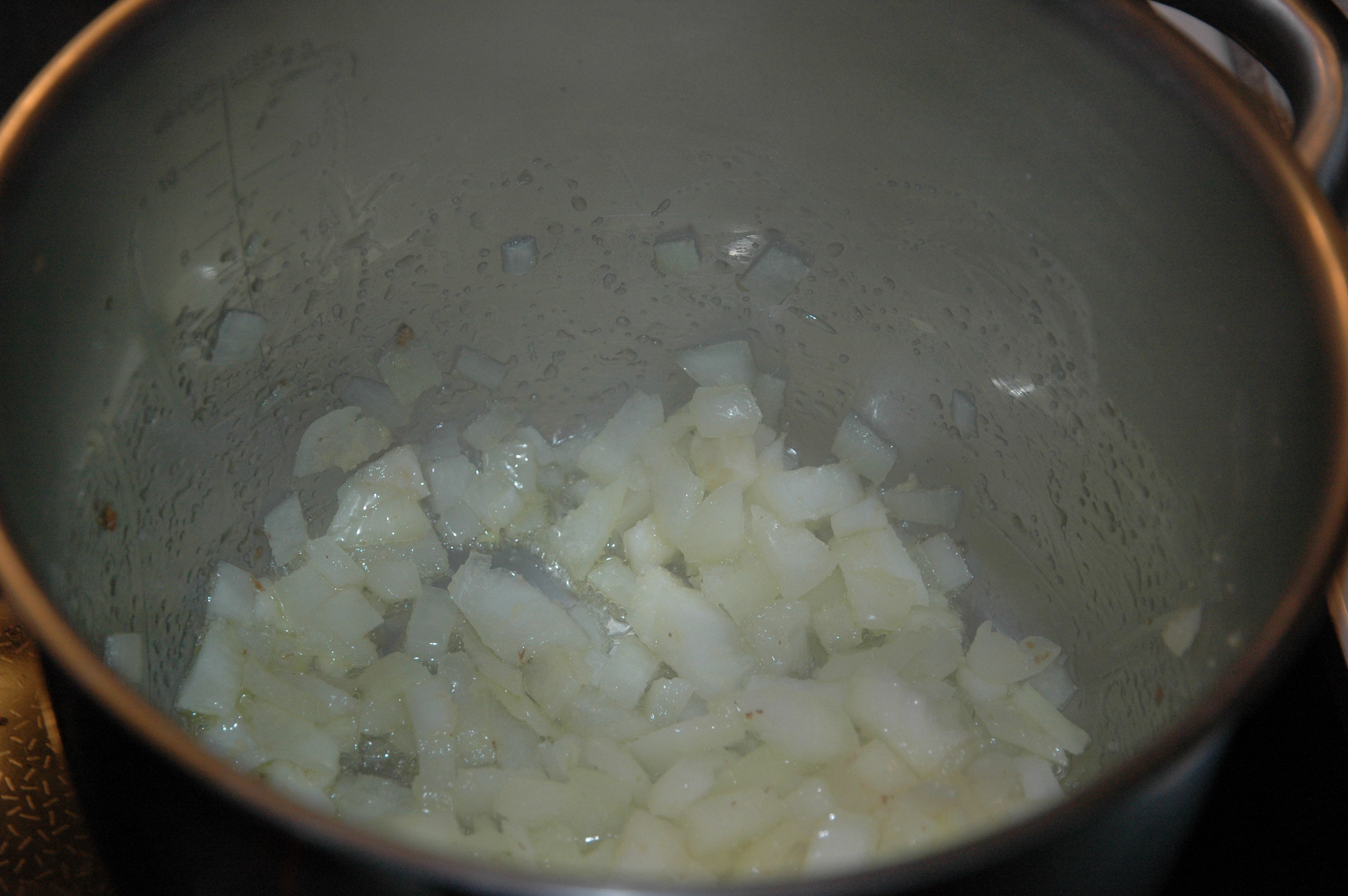 In a pan with two tablespoon of vegetable oil cook one peeled and diced onion translucent.