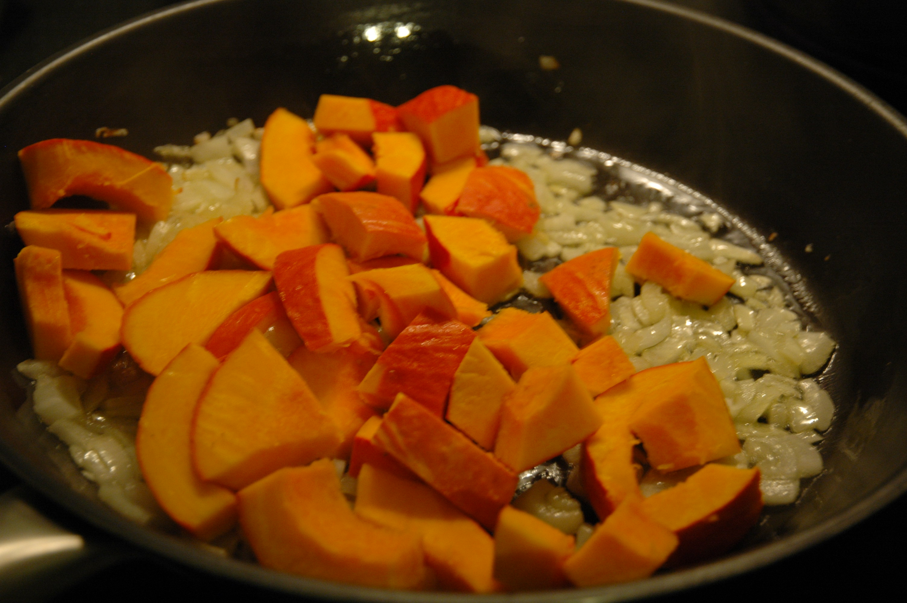 Wash one hokkaido, half it and remove the seeds with a spoon, then dice it. Add the pumpkin pieces to the onion and stir-fry them.
