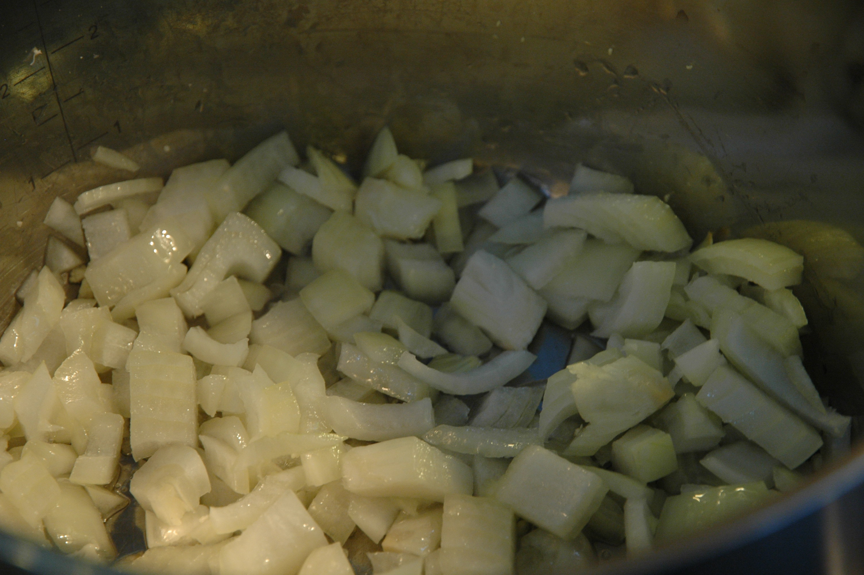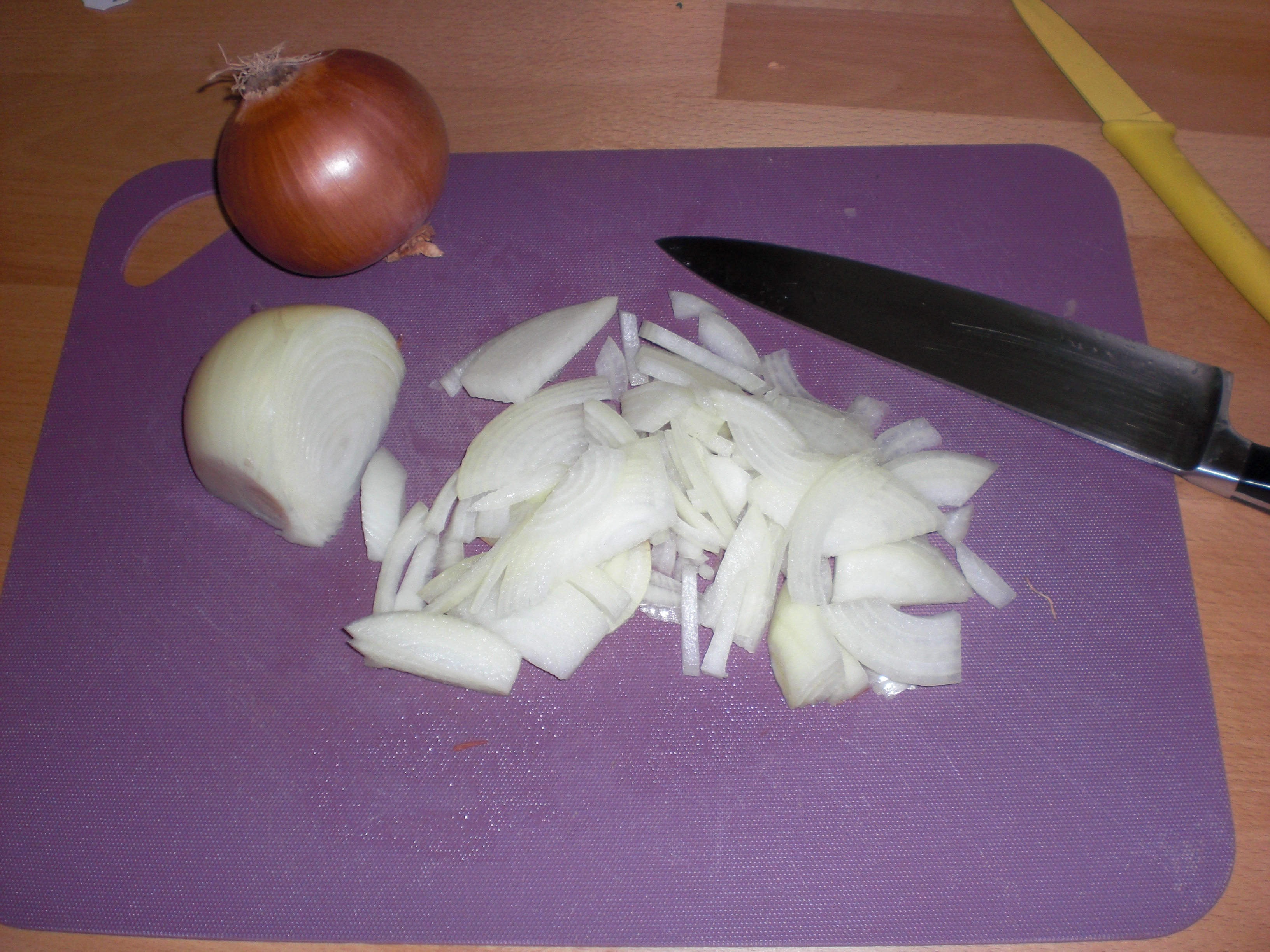 Peel and slice three onions and cook them translucent. |