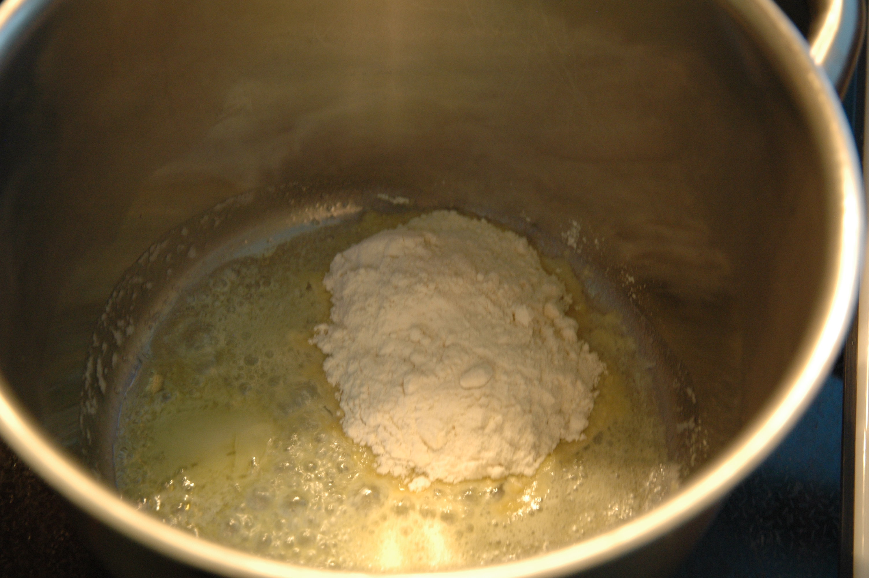 | Heat three table spoons of olive oil and four cloves of garlic in a large pot. |