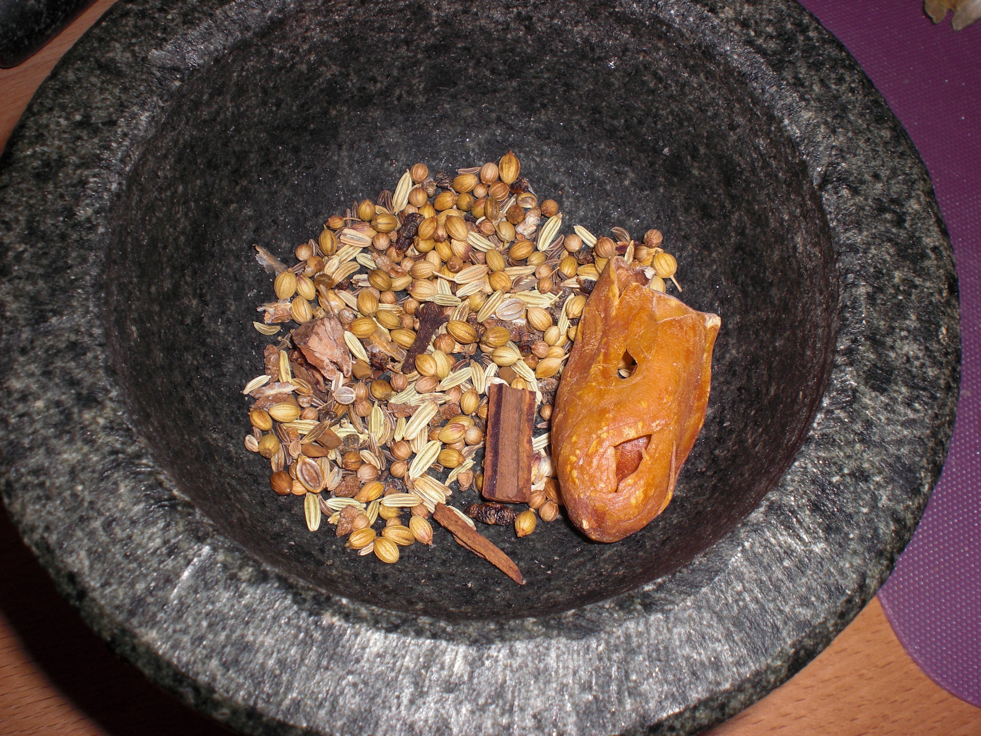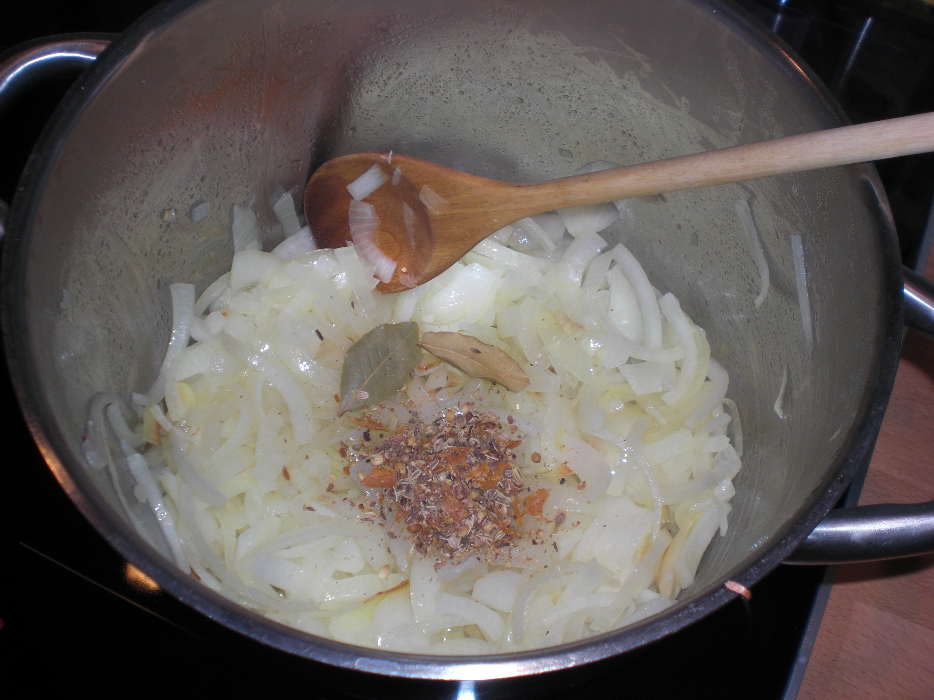 | Grind one tea spoon of coriander seeds, one tea spoon of fennel seeds, one tea spoon of caraway, one tea spoon of black pepper, four cloves, one small piece of cinnamon and one mace in a mortar and cook the spices and two bayleafs with the onions. |