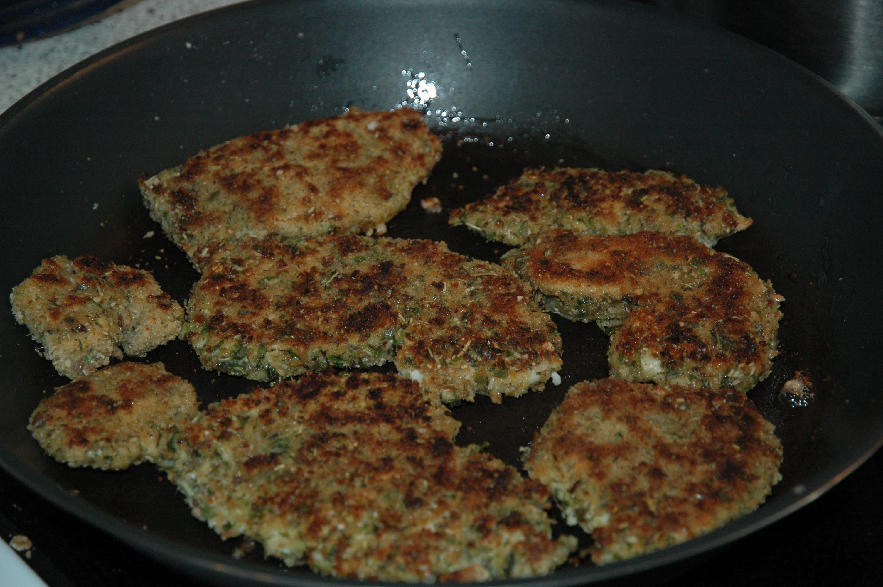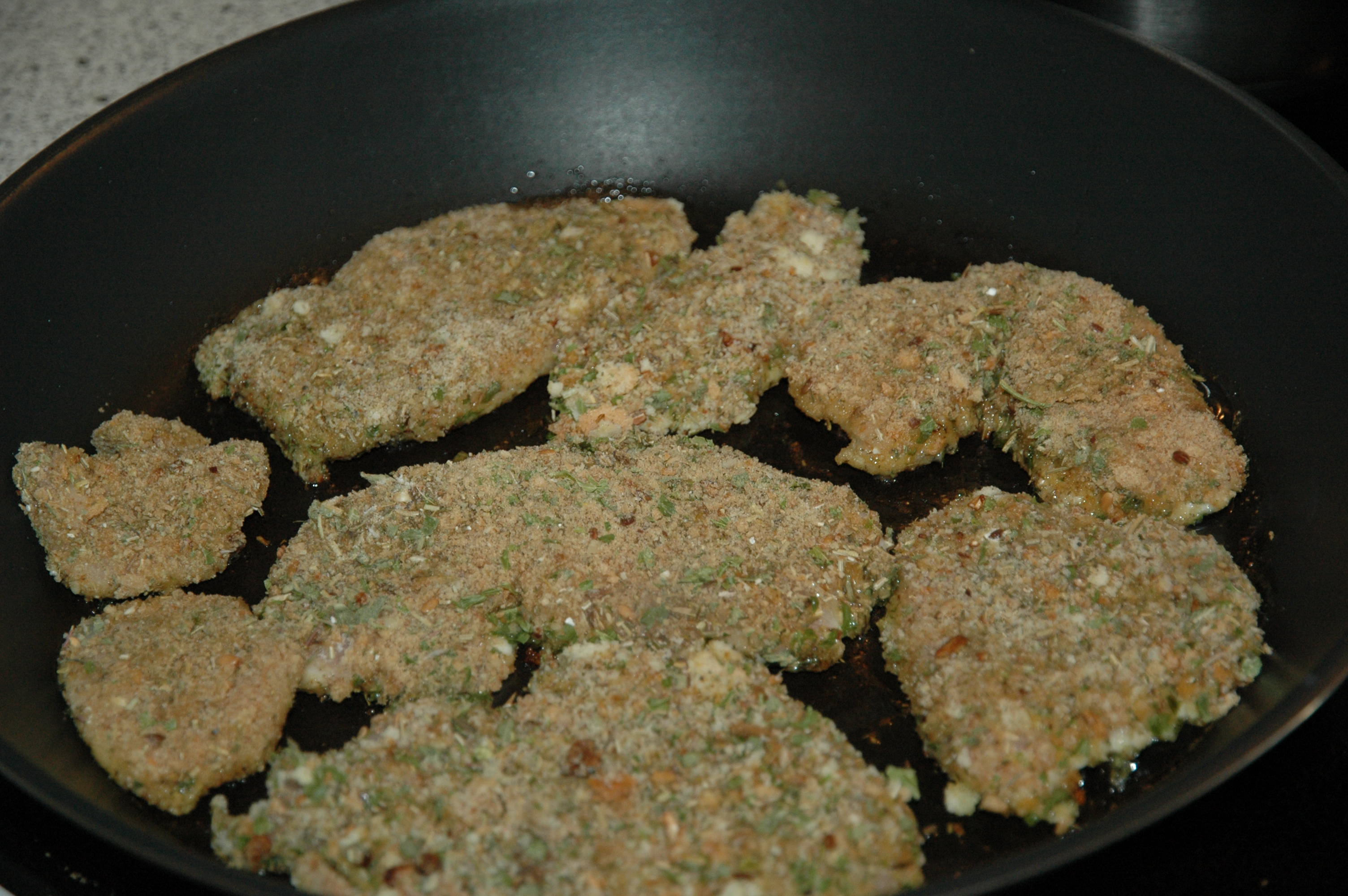 On one plate mix five tablespoons of bread crumbs, one teaspoon of garlic powder, one teaspoon of parsley, one teaspoon of rosemary, one teaspoon of thyme and one teaspoon of sage. Put two tablespoons of flour onto another plate and whisk one egg on a third plate. Coat the cutlets with breadcrumbs by first dredging them in flour, then in egg and afterwards in the breadcrumbs. |
