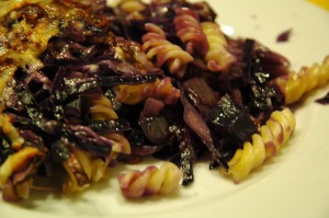 (3 servings) Cook 250 grams of pasta according to the package description. Remove the outer leaves of one red cabbage, remove the stem and cut it...