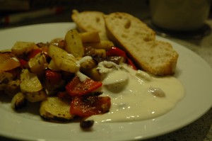 (2 servings) Peel 500 grams of parsley root and one red onion. Wash three capsicums. Slice the vegetables and place them on a oven tray. Sprinkle...
