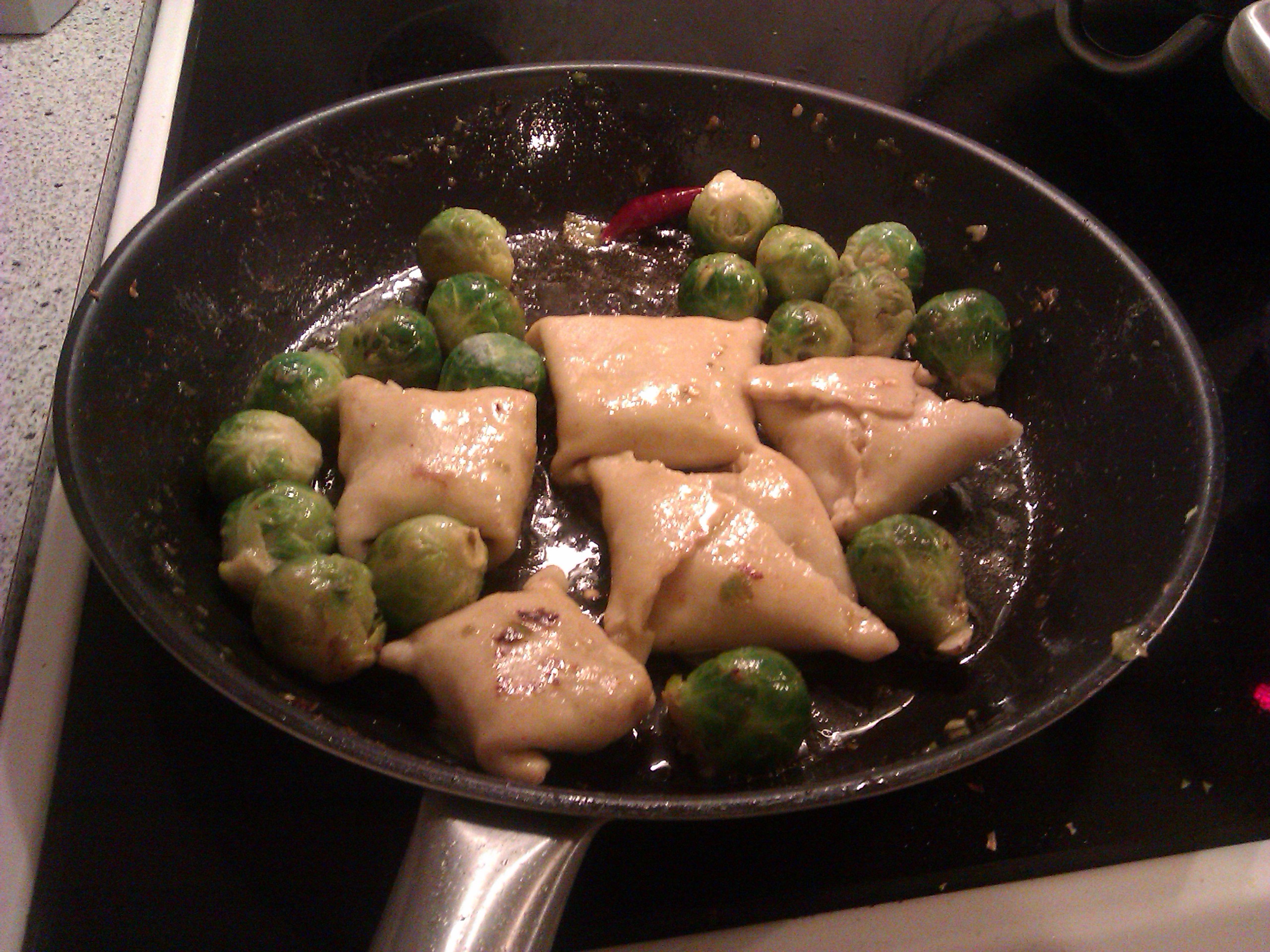 In a big pan melt a tablespoon of butter add 1 tablespoon of oilve oil, a chilli, 4 tablespoons of the ravioli water, the cooked ravioli and the decanted brussels sprouts. Spice with a handful of parsley, a pinch of nutmeg, salt and pepper.