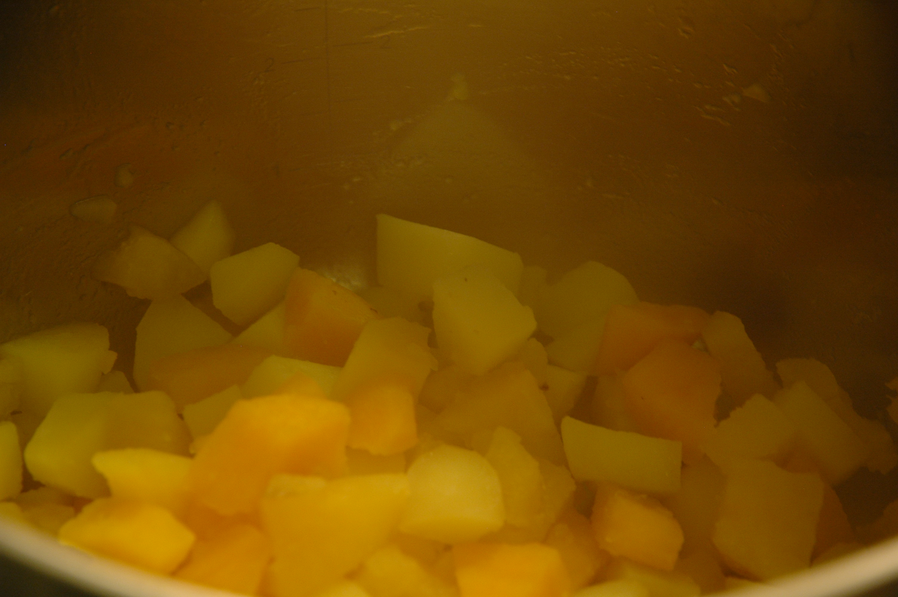 Peel 200 grams of sweet potatoes and 300 grams of potatoes and cut them into pieces.