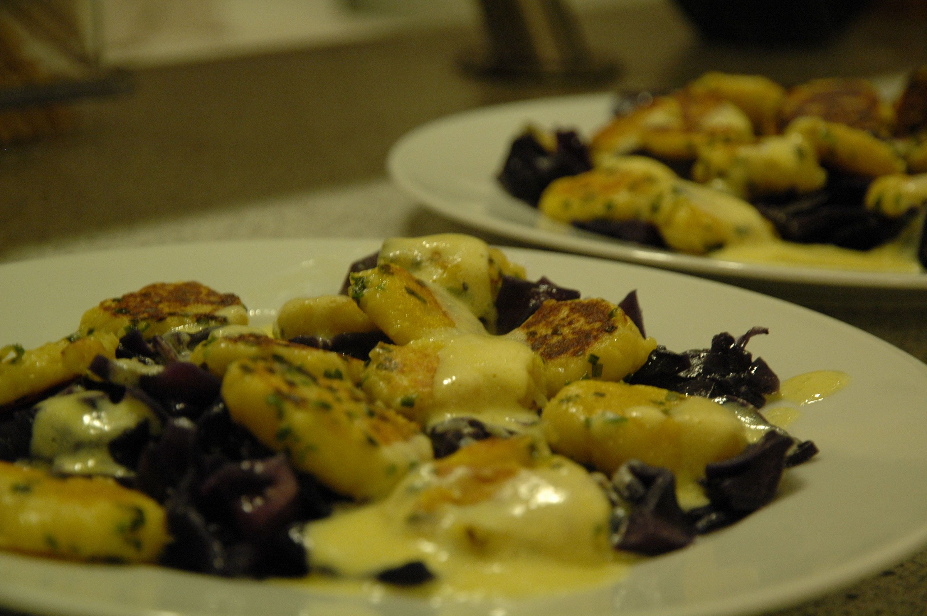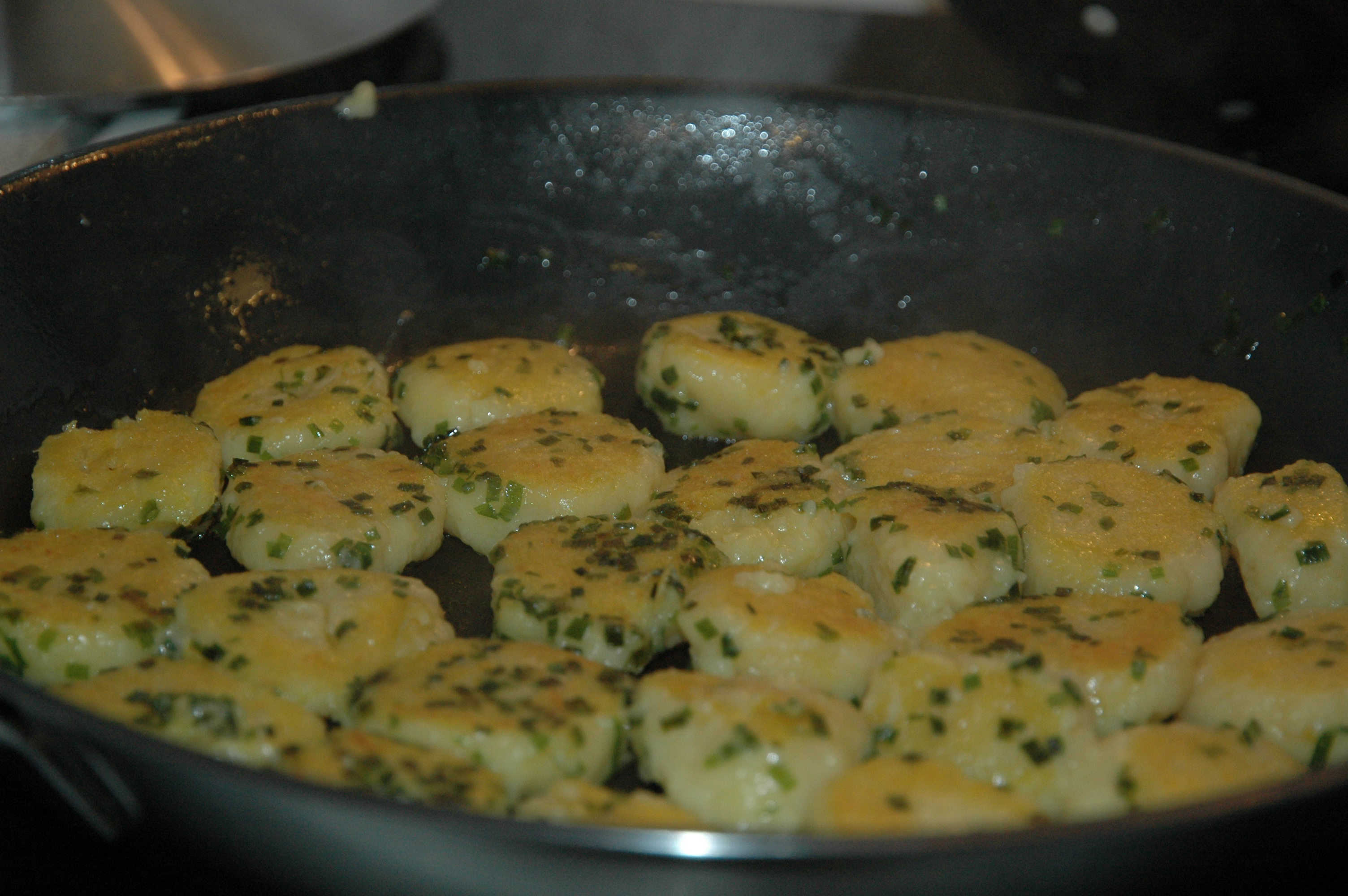In a pan heat one tablespoon of butter and one teaspoon of chives and brown the gnocchis in five minutes.