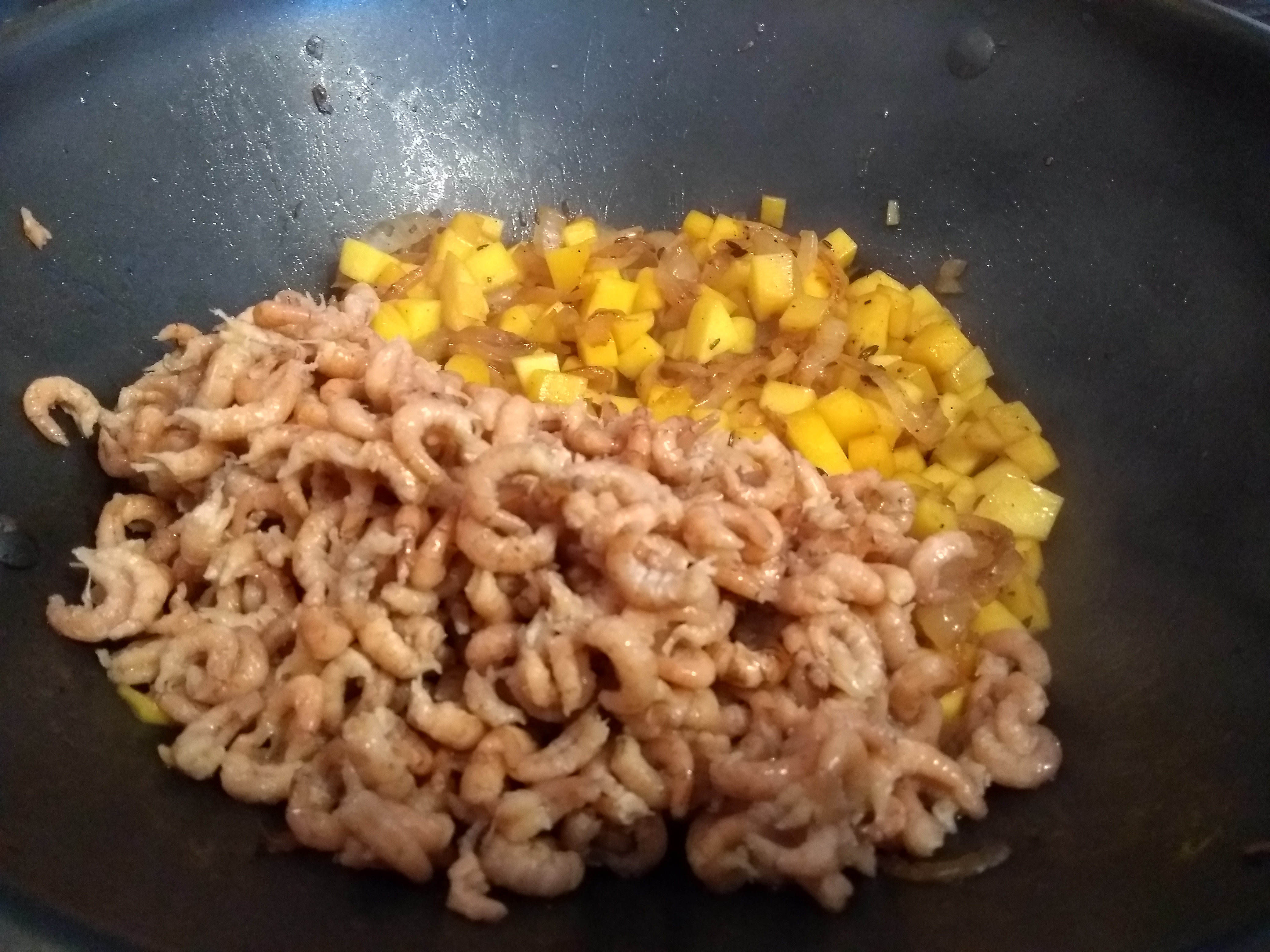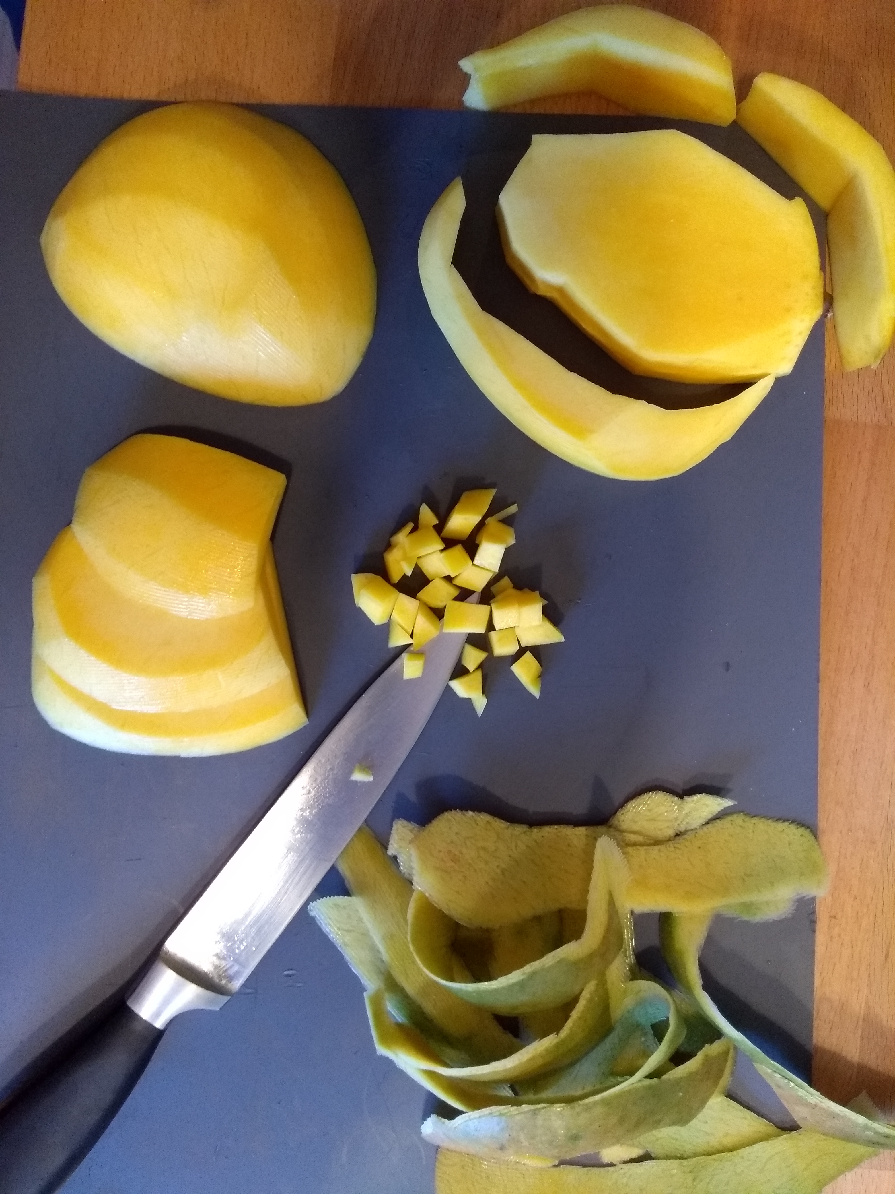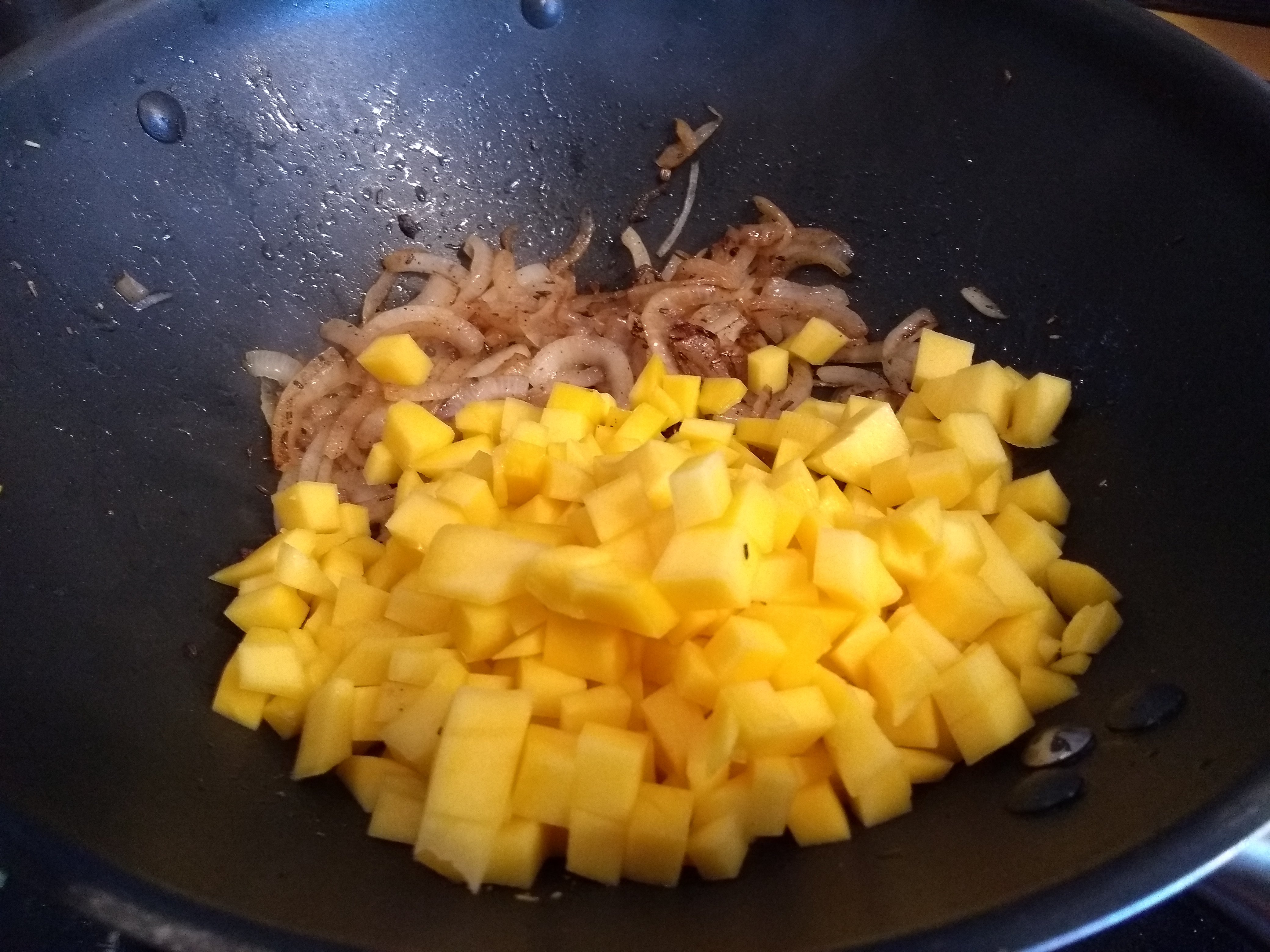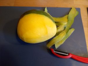 Peel, dice and add one mango. Cook for 5 minutes. |