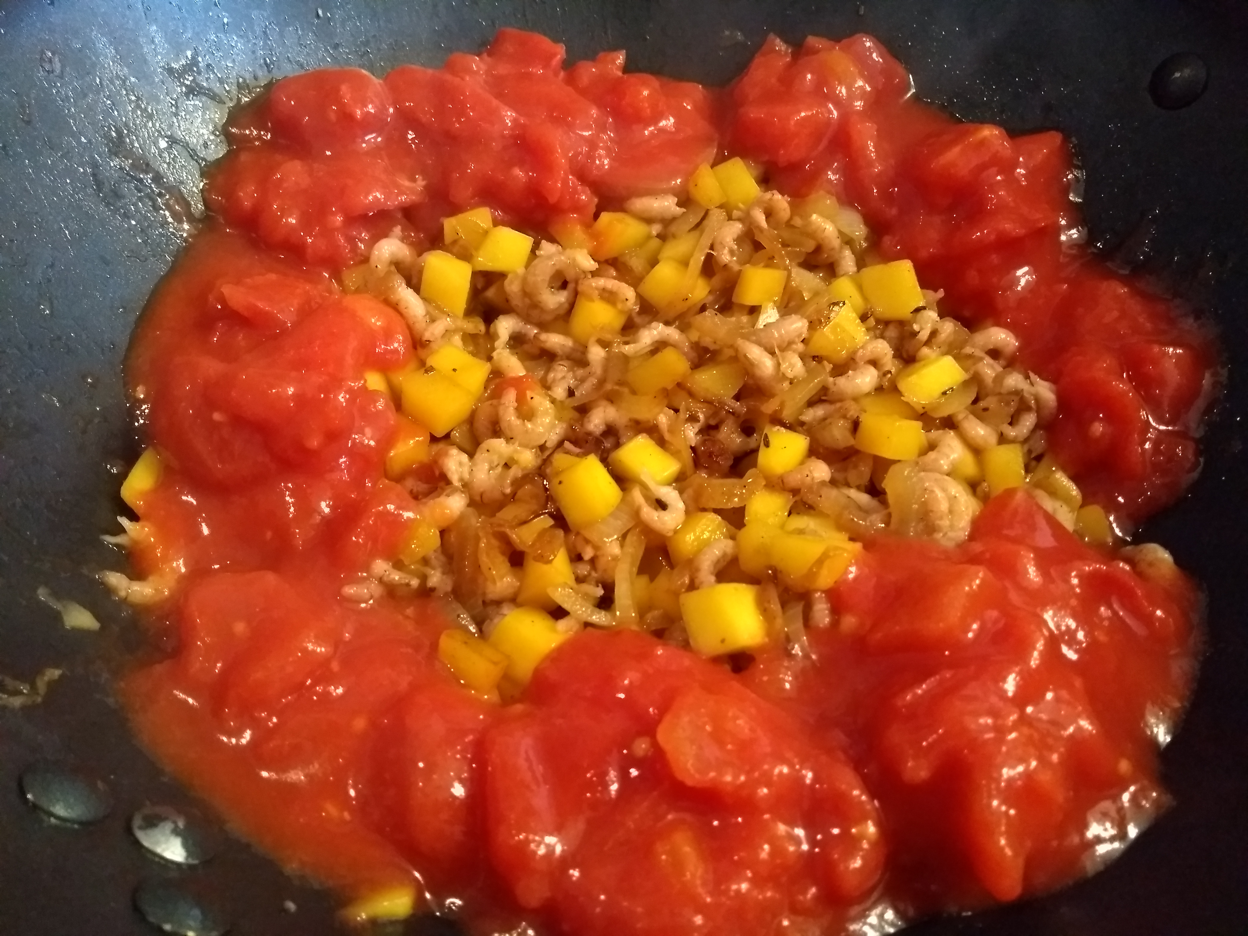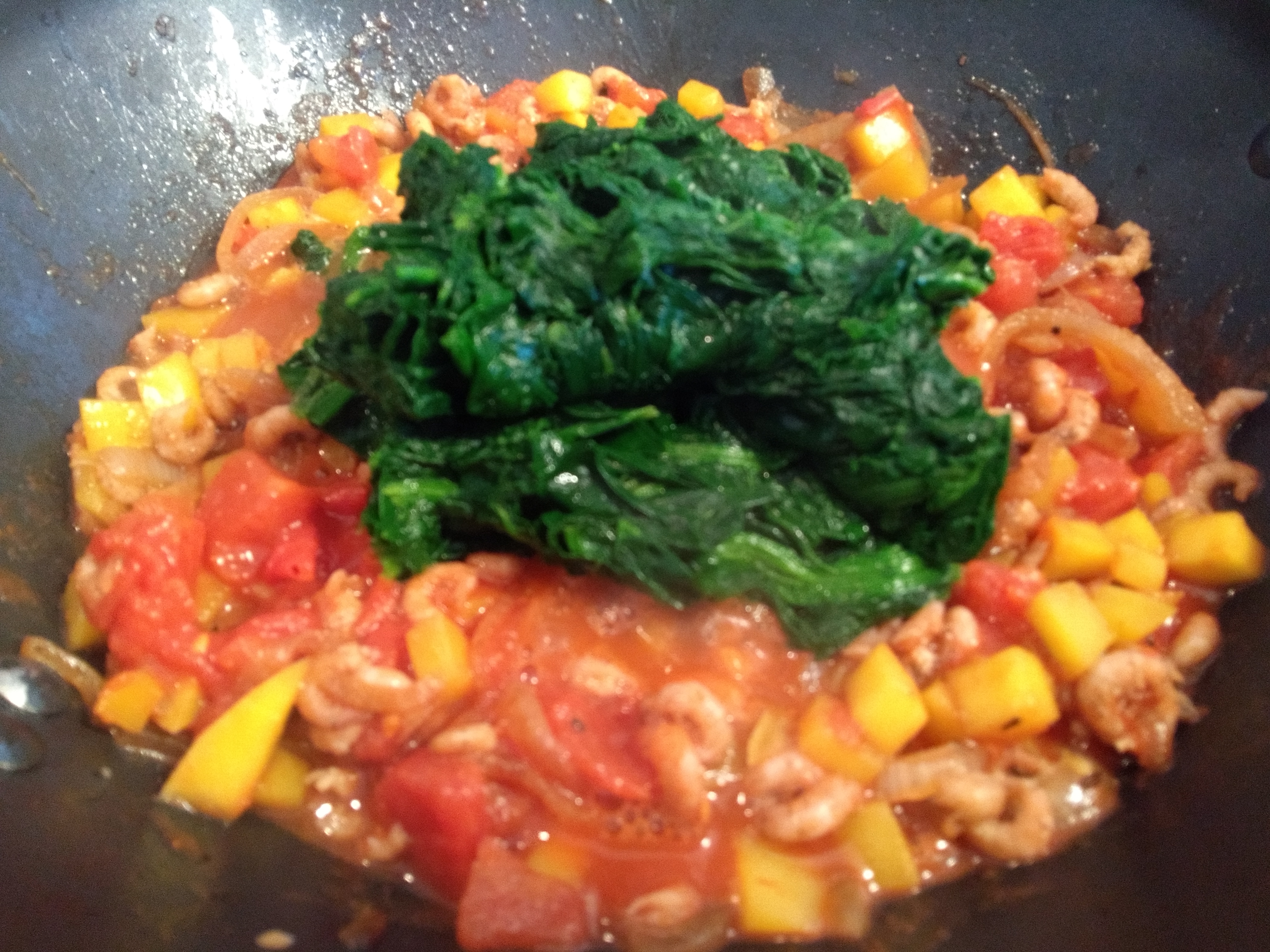 | Add 200 grams of crab meat, one can of diced tomatoes and 200 grams of frozen spinach leaves. |