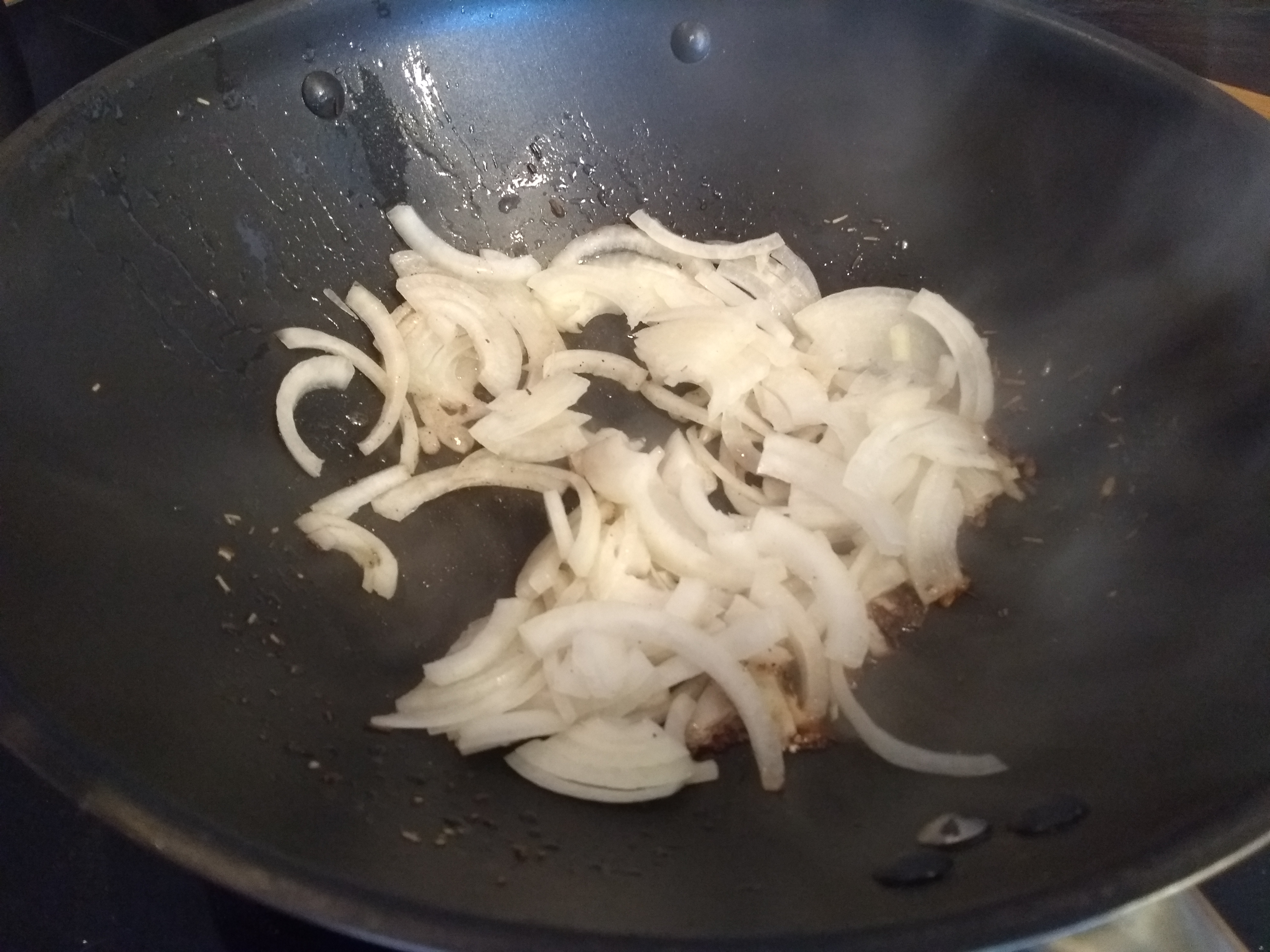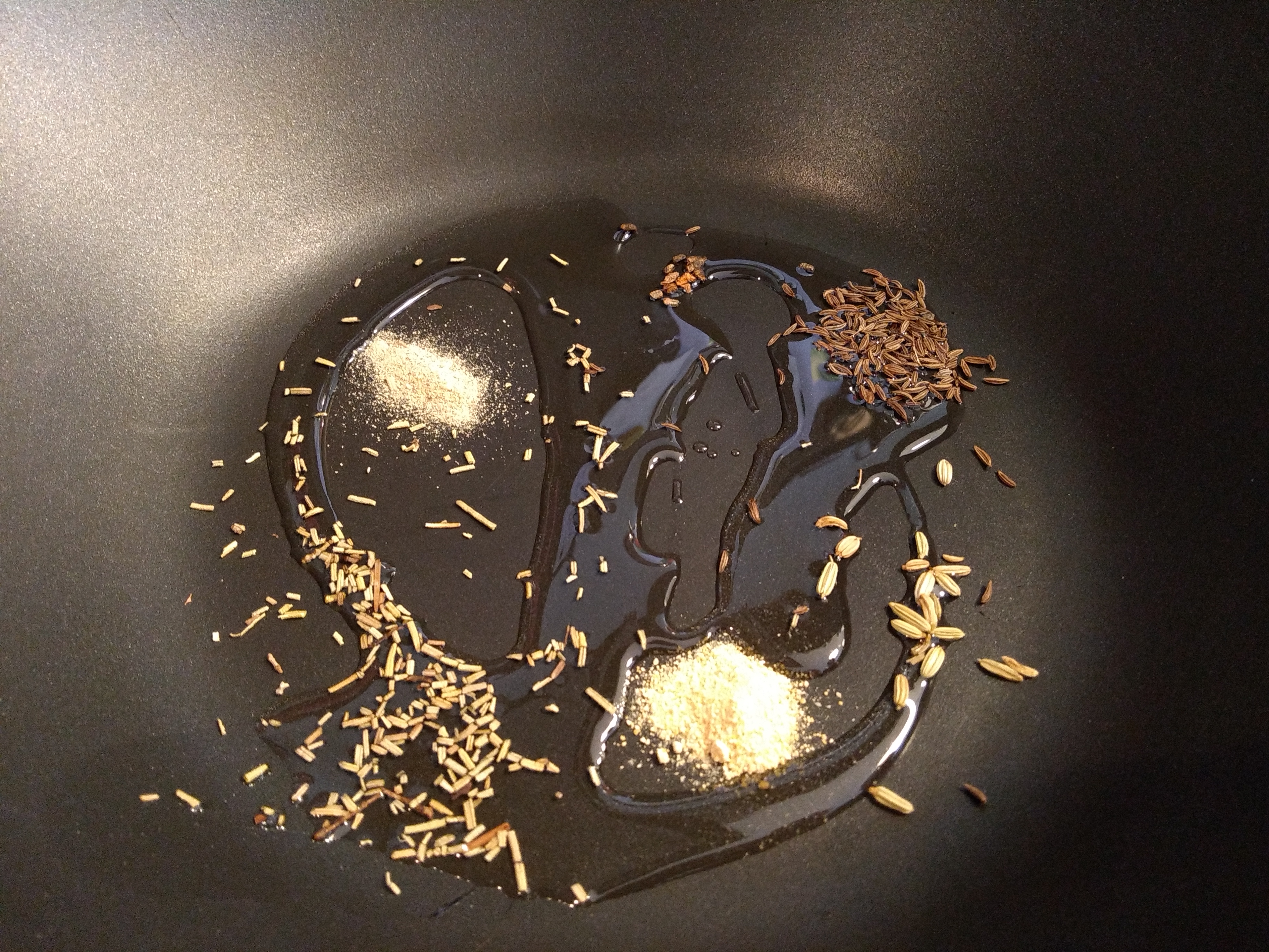 | Fry one teaspoon of fenugreek, one teaspoon of rosemary, one teaspoon of fennel, one teaspoon of turmeric and one teaspoon of caraway in two tablespoons of oil. Afterwards cook one sliced onion translucent in the spiced oil. |